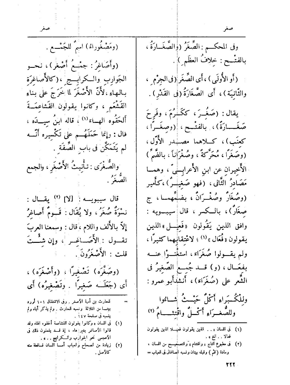 (وأَصَاغِرُ: جمْعُ أَصْغر) ، نَحْو الجَوارِبِ والكرابِجِ، (كالأَصاغِرَةِ بالهاءِ) ، لأَنّ الأَصْغَرَ لما خَرَجَ على بناءِ القَشْعَمِ، وَكَانُوا يَقُولُونَ القَشاعِمَةَ أَلحَقُوه الهاءَ، قَالَه ابنُ سِيدَه قَالَ: وإِنما حَمَلَهُم على تَكْسِيره أَنّه لم يَتَمَكَّن فِي بابِ الصِّفَةِ.