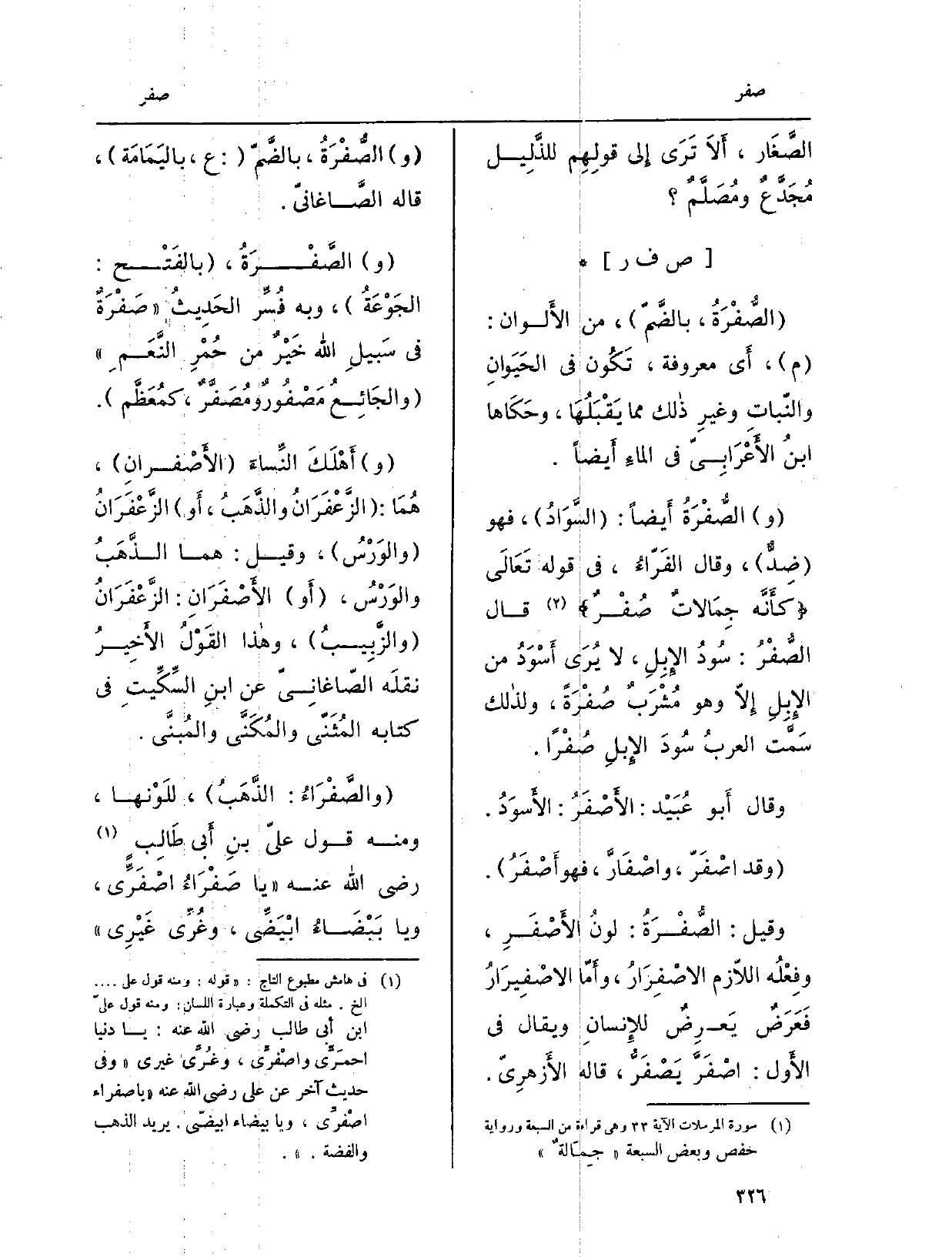 (و) الصُّفْرَةُ أَيضاً: (السَّوَادُ) ، فَهُوَ (ضِدٌّ) ، وَقَالَ الفَرّاءُ، فِي قَوْله تَعَالَى: {12. 028 كَأَنَّهُ جمالات صفر} (المرسلات: 33) ، قَالَ الصُّفْرُ: سُودُ الإِبِلِ، لَا يُرَى أَسْوَدُ من الإِبِلِ إِلاّ وَهُوَ مُشْرَبٌ صُفْرَةً، ولذالك سَمَّت العربُ سُودَ الإِبلِ صُفْراً.