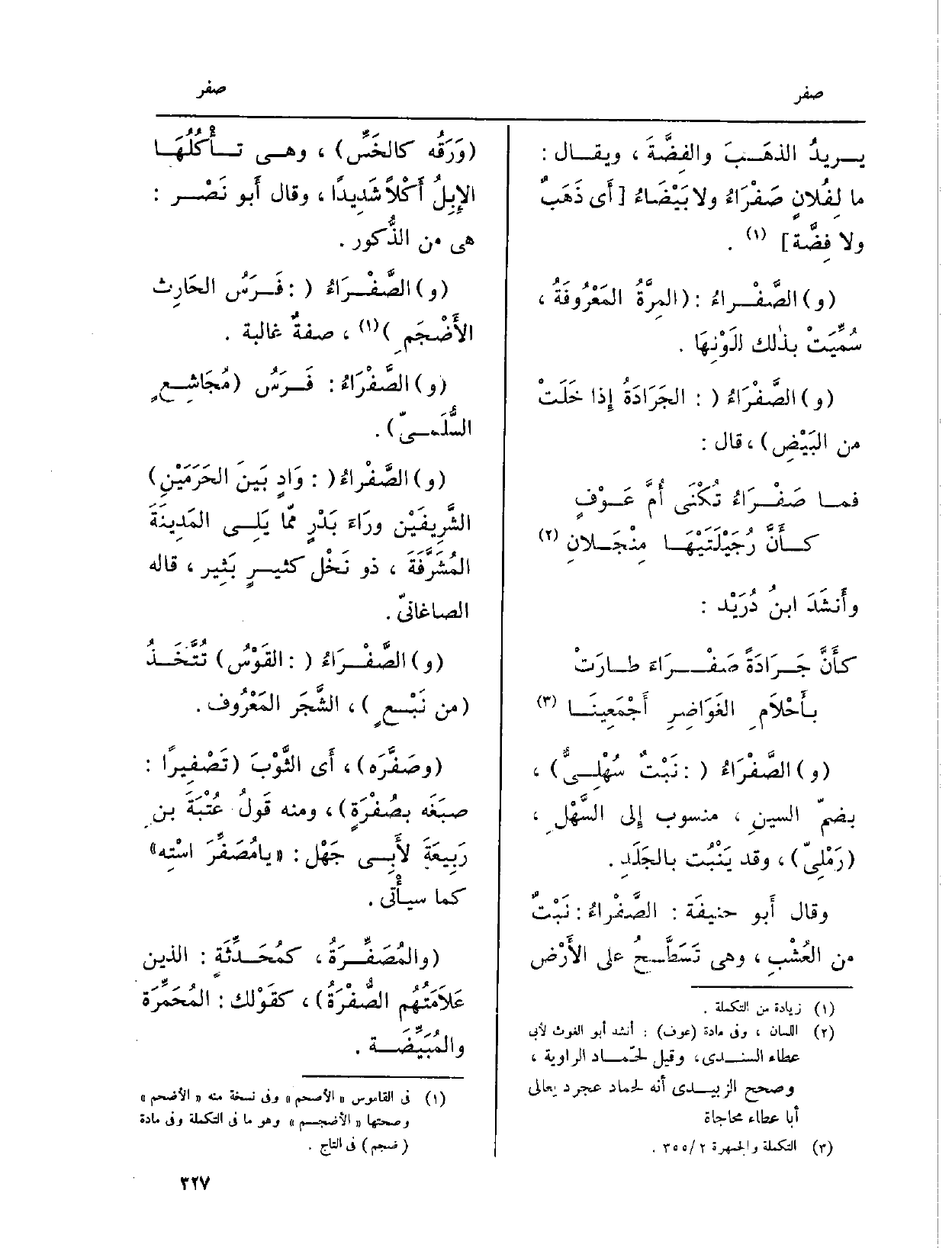 وَقَالَ أَبو حنيفَة: الصَّفْراءُ: نَبْتٌ من العُشْبِ، وَهِي تَسَطَّحُ على الأَرْض (وَرَقُه كالخَسِّ) ، وَهِي تأْكُلُهَا الإِبِلُ أَكْلاً شَدِيداً، وَقَالَ أَبو نَصْر: هِيَ من الذُّكور.