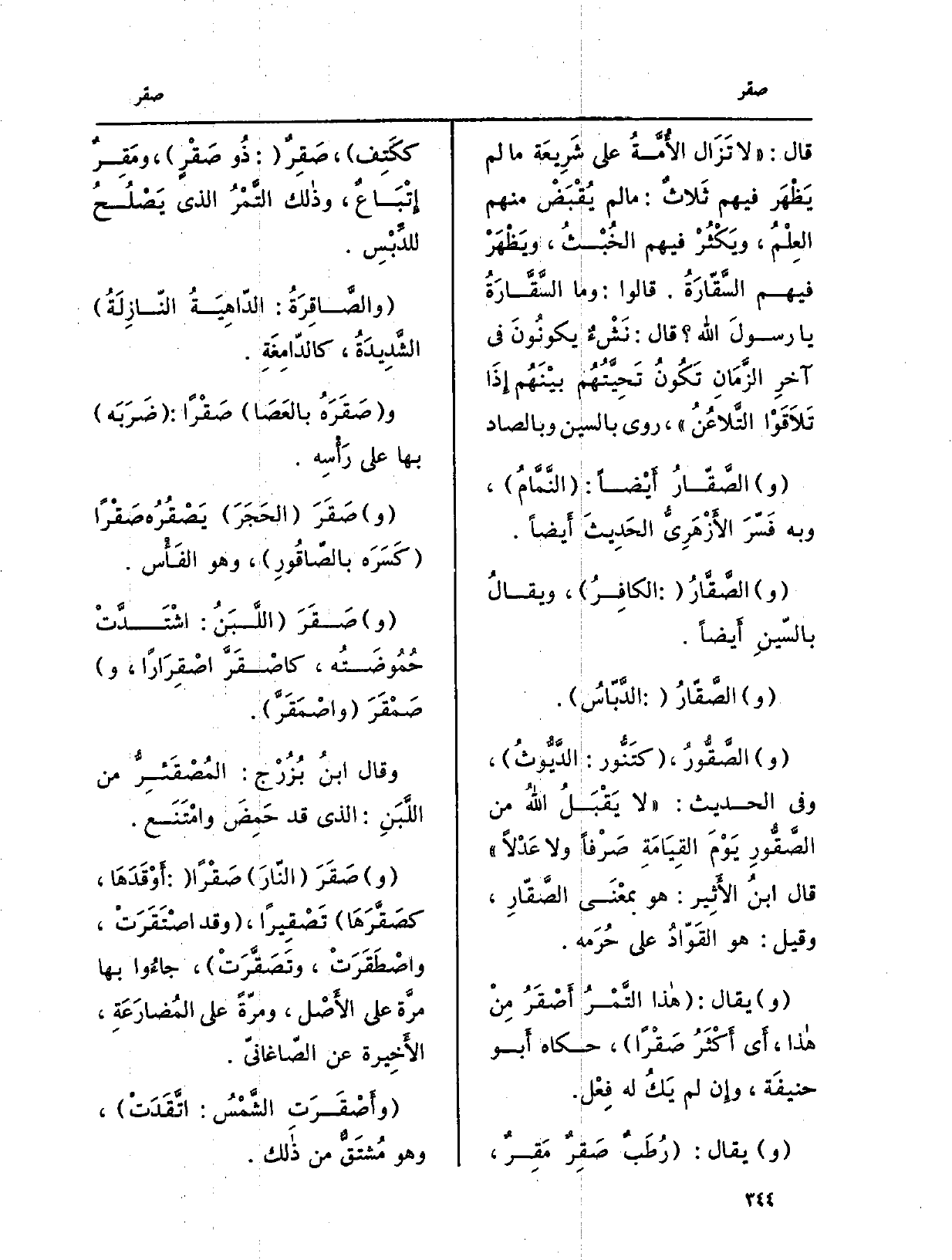 قَالَ: (لَا تَزَال الأُمَّةُ على شَرِيعَة مَا لم يَظْهَر فيهم ثَلاثٌ: مَا لم يُقْبَضْ مِنْهُم العِلْمُ، ويَكْثُرْ فيهم الخُبْثُ، ويَظْهَرْ فيهم السَّقّارَةُ. قَالُوا: وَمَا السَّقَّارَةُ يَا رَسُول الله؟ قَالَ: نَشْءٌ يكونُونَ فِي آخرِ الزَّمَانِ تَكُونُ تَحِيَّتُهُم بيْنَهُم إِذَا تَلاَقَوْا التَّلاعُنُ) ، روى بِالسِّين وبالصاد.