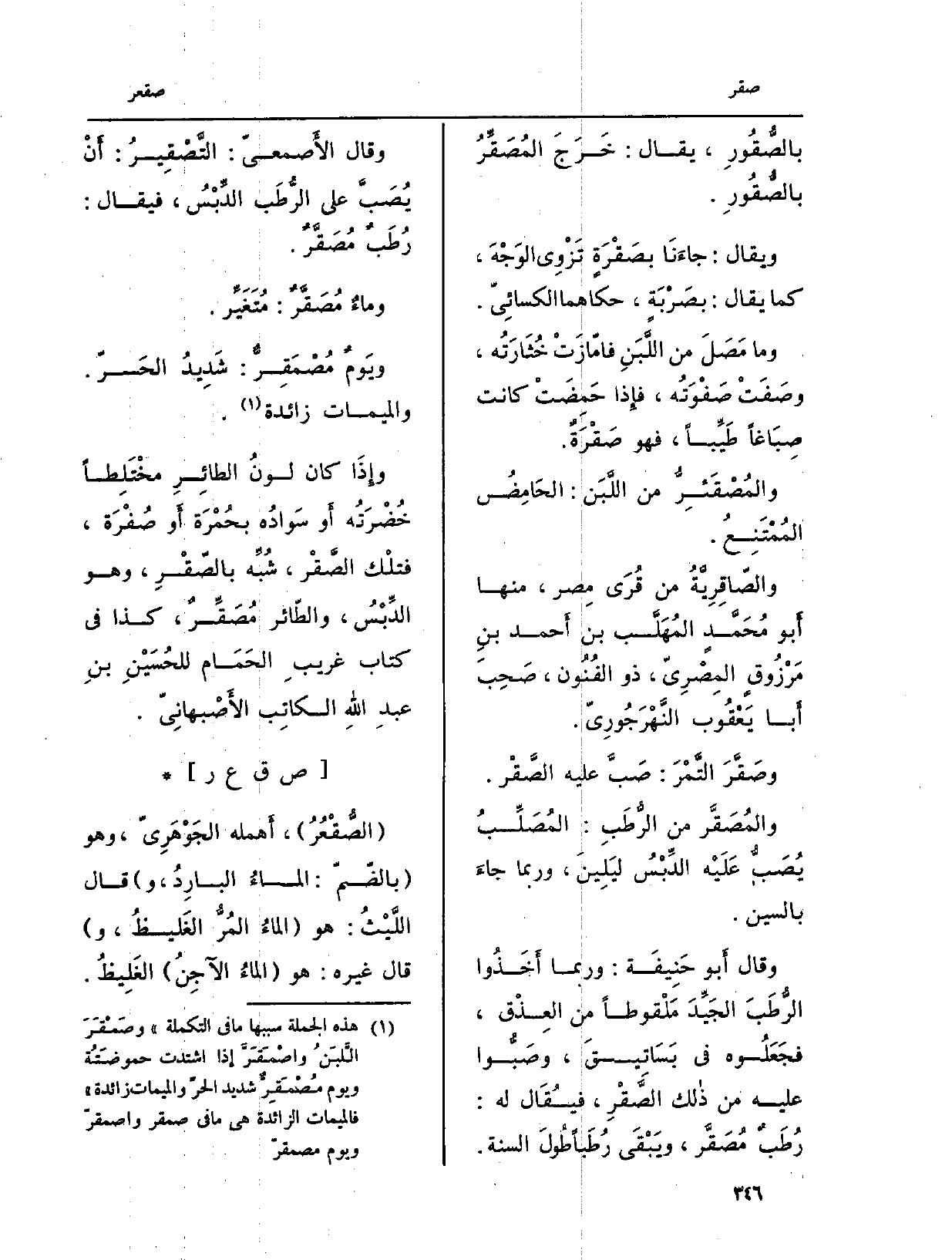 وَقَالَ الأَصمعيّ: التَّصْقِيرُ: أَنْ يُصَبَّ على الرُّطَب الدِّبْسُ، فَيُقَال: رُطَبٌ مُصَقَّرٌ.