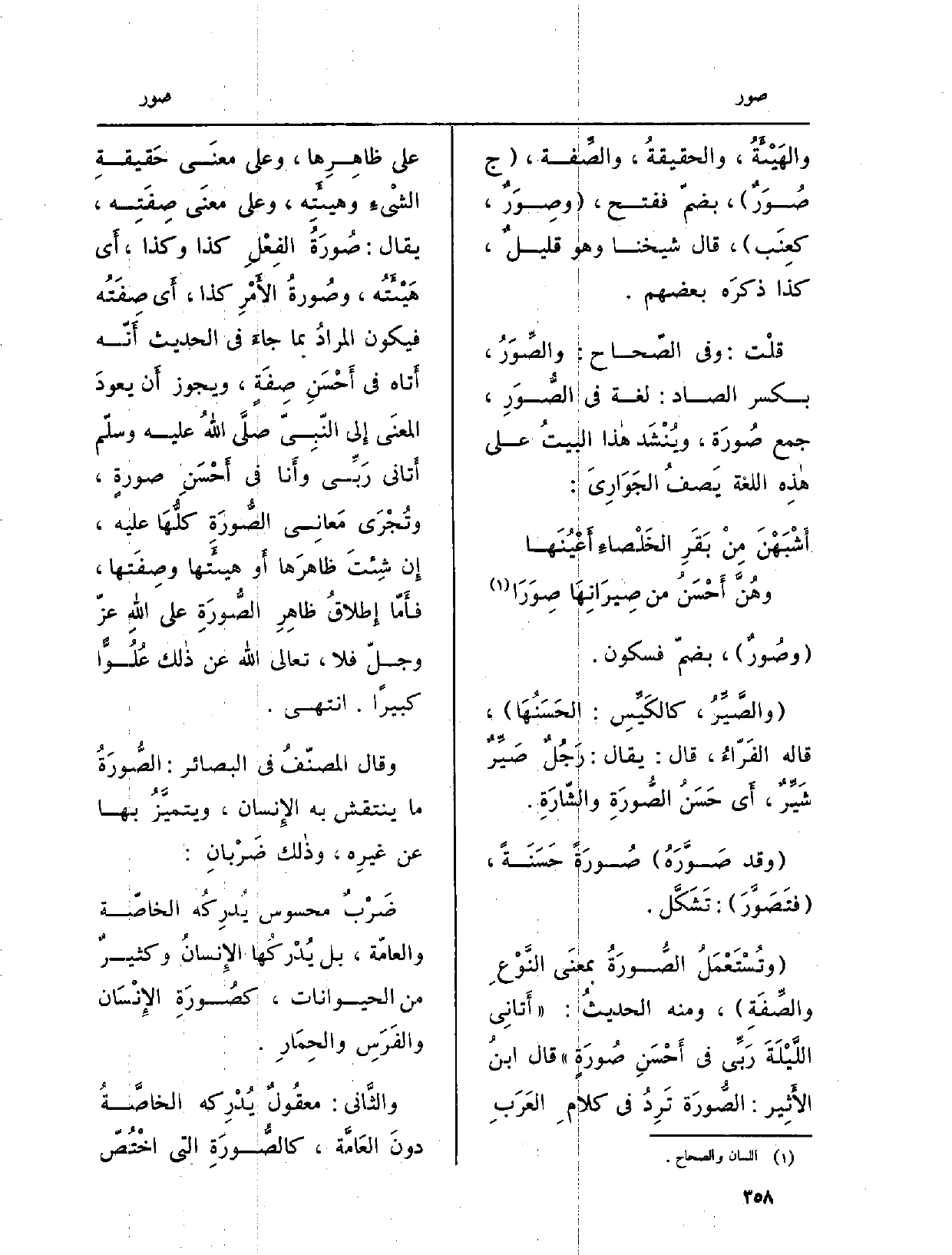وَقَالَ المصنّفُ فِي البصائر:} الصُّورَةُ مَا ينتقش بِهِ الإِنسان، ويتميَّزُ بهَا عَن غيرِه، وذالك ضَرْبانِ:
