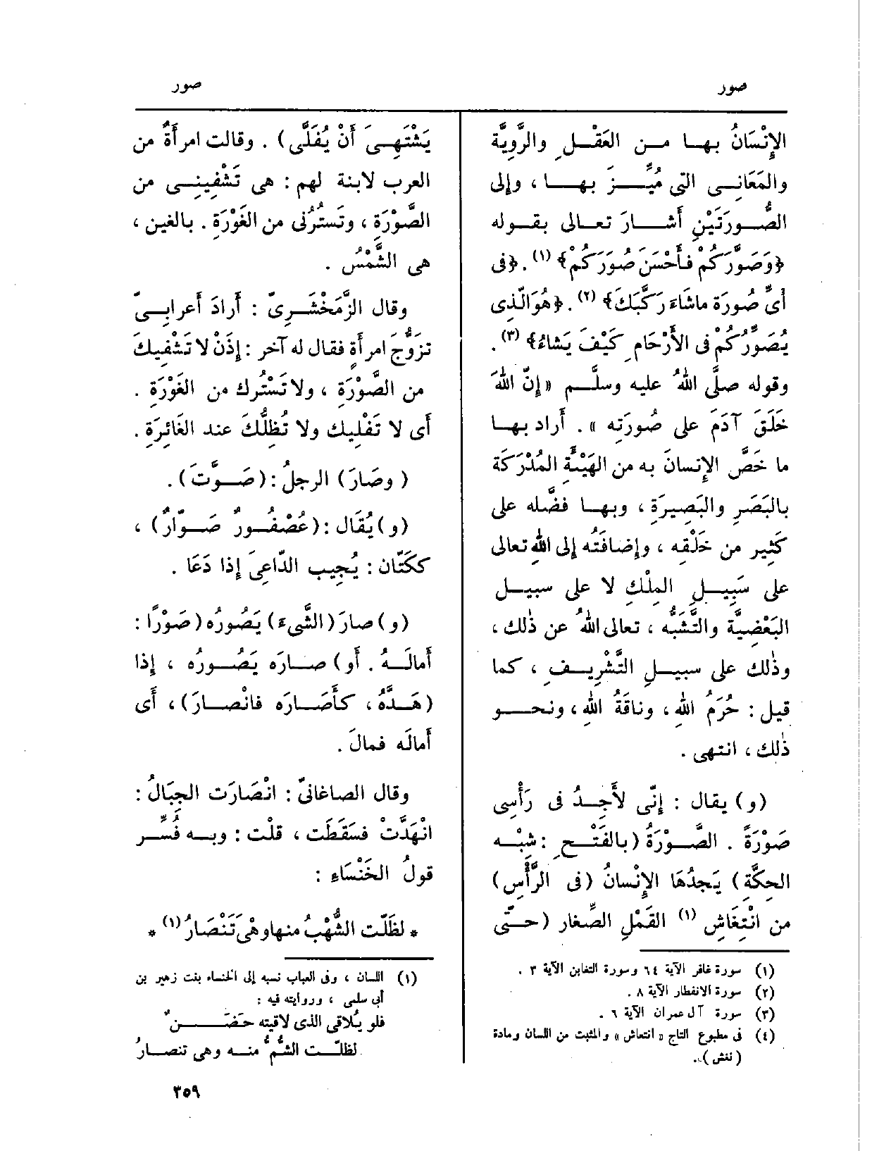 الإِنْسَانُ بهَا من العَقْلِ والرَّوِيَّة والمَعَانِي الَّتِي مُيِّزَ بهَا، وإِلى {الصُّورَتَيْنِ أَشارَ تَعَالَى بقوله: {} وَصَوَّرَكُمْ فَأَحْسَنَ {صُوَرَكُمْ} (غَافِر: 64) ، {فِى أَىّ} صُورَةٍ مَّا شَآء رَكَّبَكَ} (الانفطار: 8) ، {هُوَ الَّذِي {يُصَوّرُكُمْ فِي الاْرْحَامِ كَيْفَ يَشَآء} (آل عمرَان: 6) . وَقَوله صلى الله عَلَيْهِ وَسلم (إِنّ اللَّهَ خَلَقَ آدَمَ على} صُورَتِه) . أَراد بهَا مَا خَصَّ الإِنسانَ بِهِ من الهَيْئَةِ المُدْرَكَة بالبَصَرِ والبَصِيرَةِ، وَبهَا فضَّله على كَثِير من خَلْقِه، وإِضافَتُه إِلى اللَّهِ تَعَالَى على سَبِيلِ المِلْكِ لَا على سَبِيل البَعْضِيَّة والتَّشَبُّه، تَعَالَى اللَّهُ عَن ذالك، وذالك على سبيلِ التَّشْرِيفِ، كَمَا قيل: حُرَمُ اللَّهِ، وناقَةُ اللَّهِ، وَنَحْو ذالك، انْتهى.