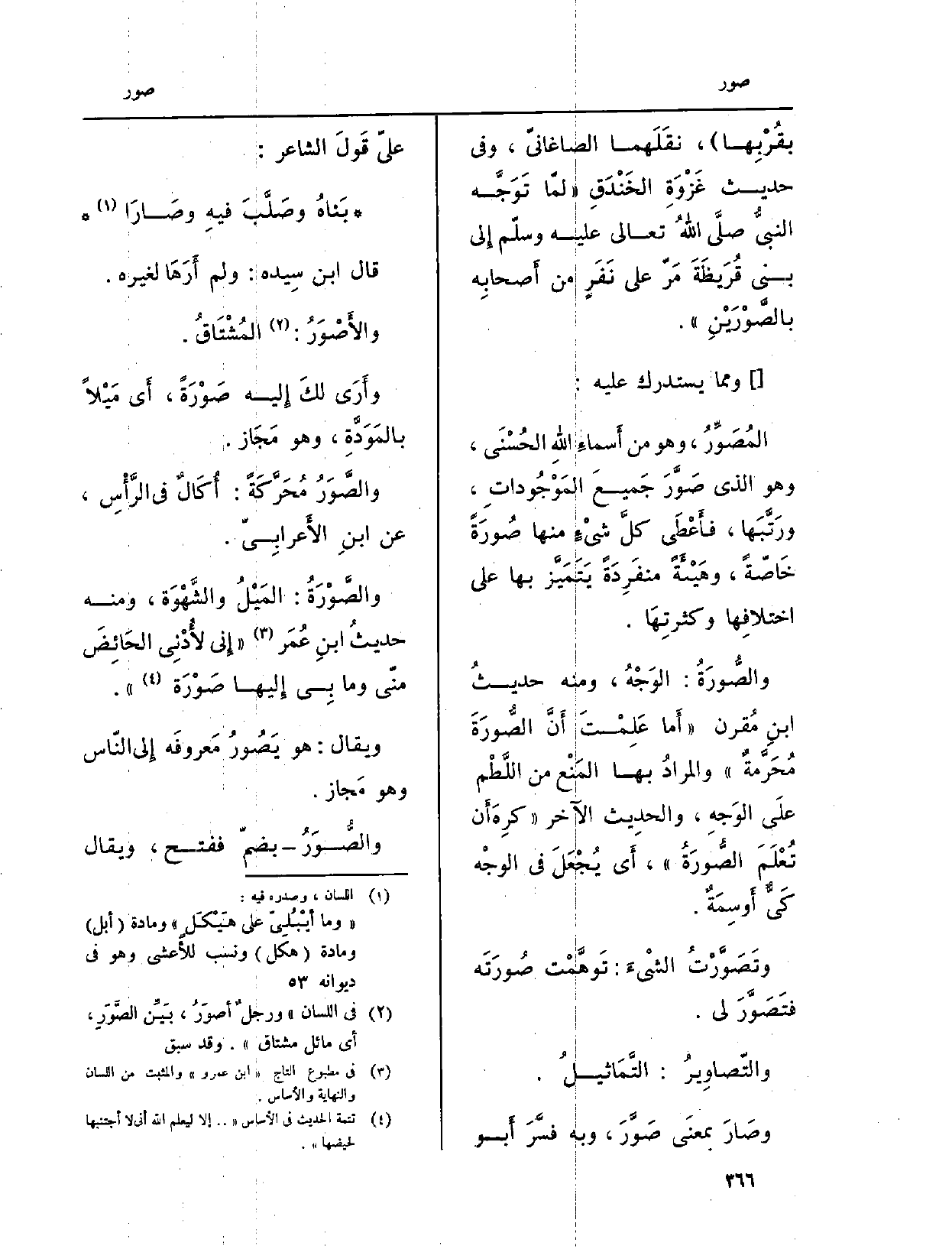 {والصُّورَةُ: الوَجْهُ، وَمِنْه حديثُ ابْن مُقرن: (أَما عَلِمْتَ أَنَّ} الصُّورَةَ مُحَرَّمَةٌ) والمرادُ بهَا المَنْع من اللَّطْم علَى الوَجهِ، والحديثِ الآخر: (كرِهَ أَن تُعْلَمَ الصُّورَةُ) ، أَي يُجْعَلَ فِي الوجْه كَيٌّ أَو سِمَةٌ.