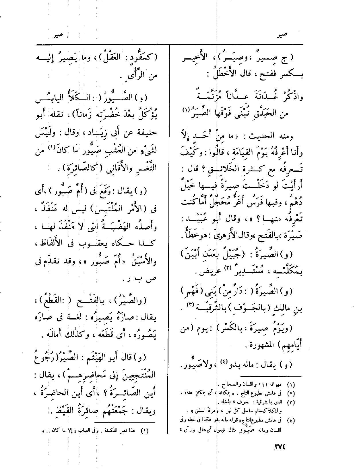 (و) قَالَ أَبو الهَيْثَم: الصَّيْرُ (رُجُوعُ المُنْتَجِعِينَ إِلى مَحاضِرِهِمْ) ، يُقَال: أَين {الصّائِرَةُ؟ أَي أَين الحاضِرَةُ، وَيُقَال: جَمَعْتُهم} صائِرَةُ القَيْظِ.