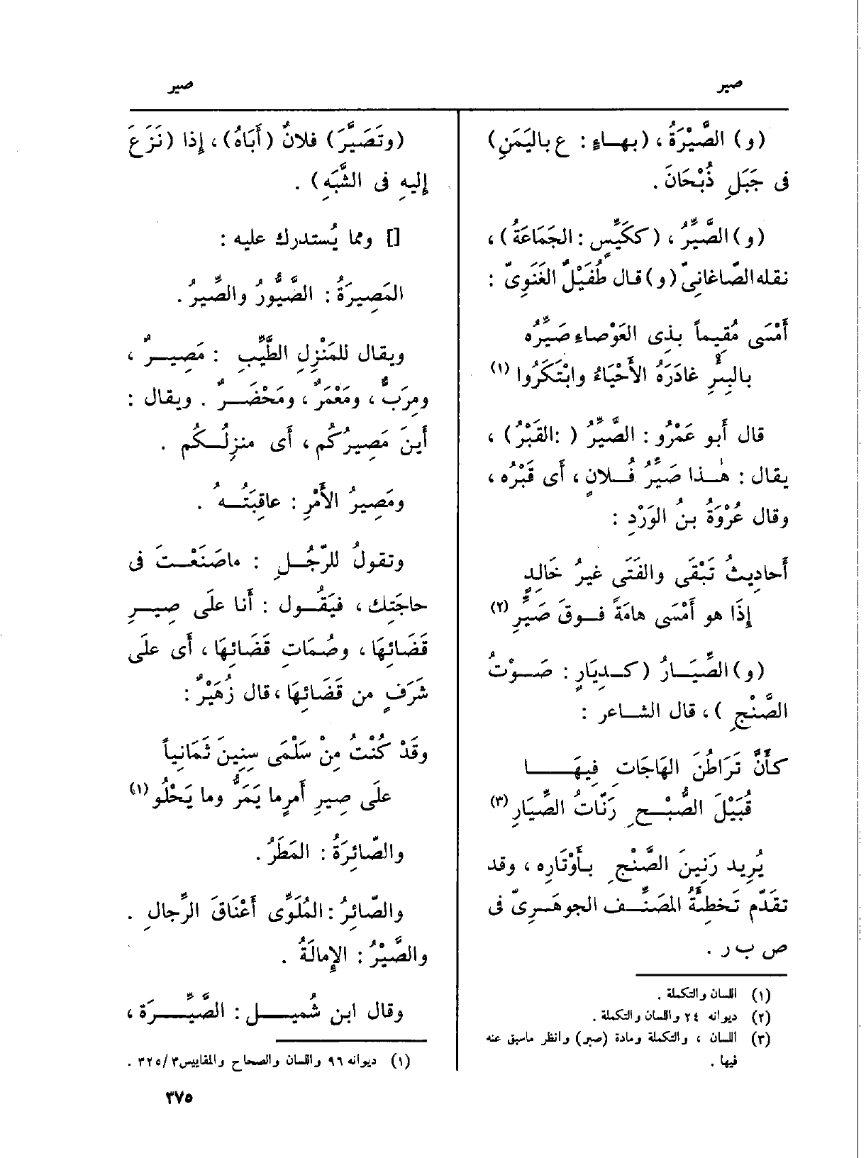 وتقولُ للرّجُلِ: مَا صَنَعْتَ فِي حاجَتِك، فيَقُول: أَنا علَى {صِيرِ قَضَائِهَا، وصُمَاتِ قَضَائِهَا، أَي علَى شَرَفٍ من قَضَائِهَا، قَالَ زُهَيْرٌ:
