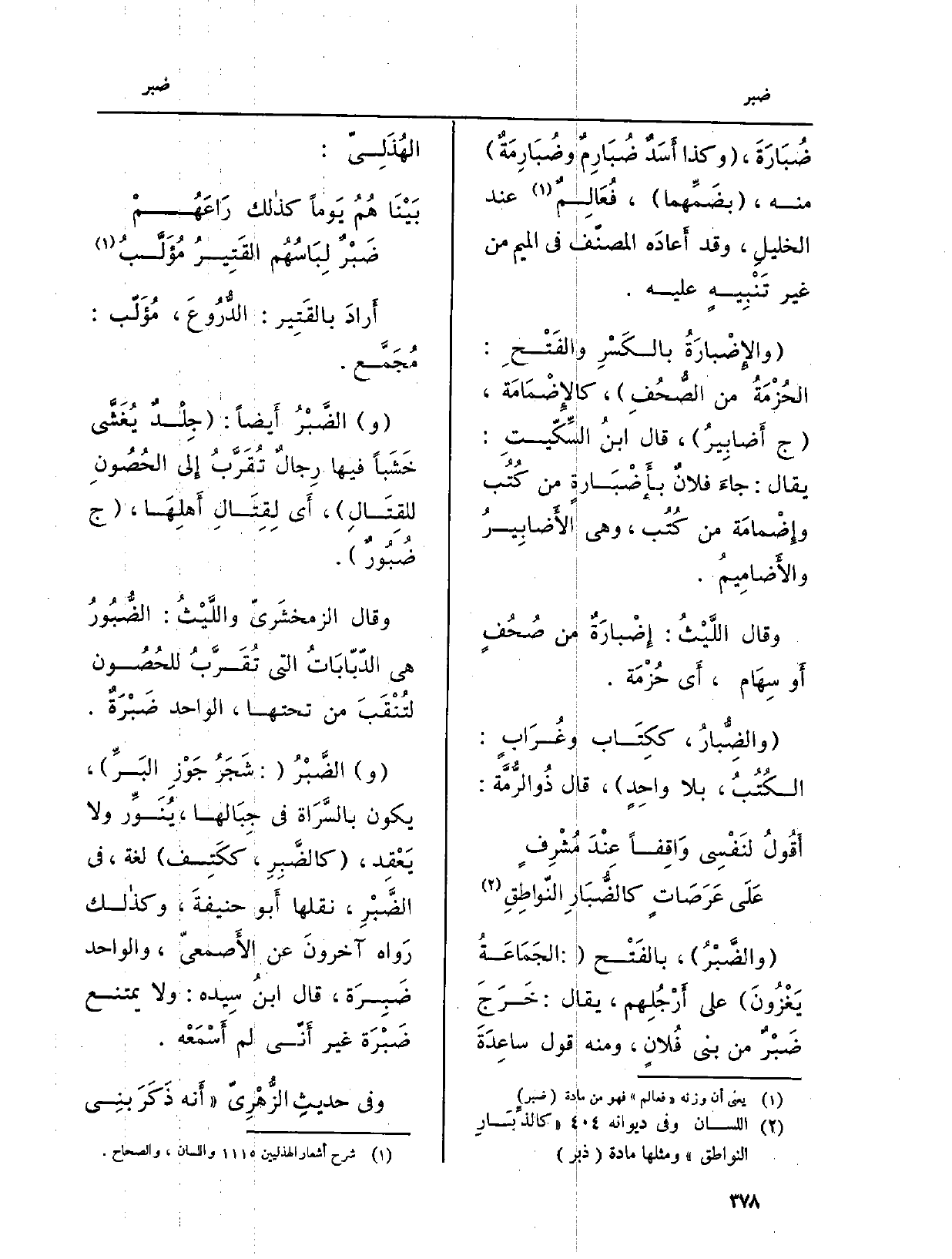وَقَالَ الزمخشَريّ واللَّيْثُ: الضُّبُورُ هِيَ الدّبّابَاتُ الَّتِي تُقَرَّبُ للحُصُون لتُنْقَبَ من تحتهَا، الْوَاحِد ضَبْرَةٌ.