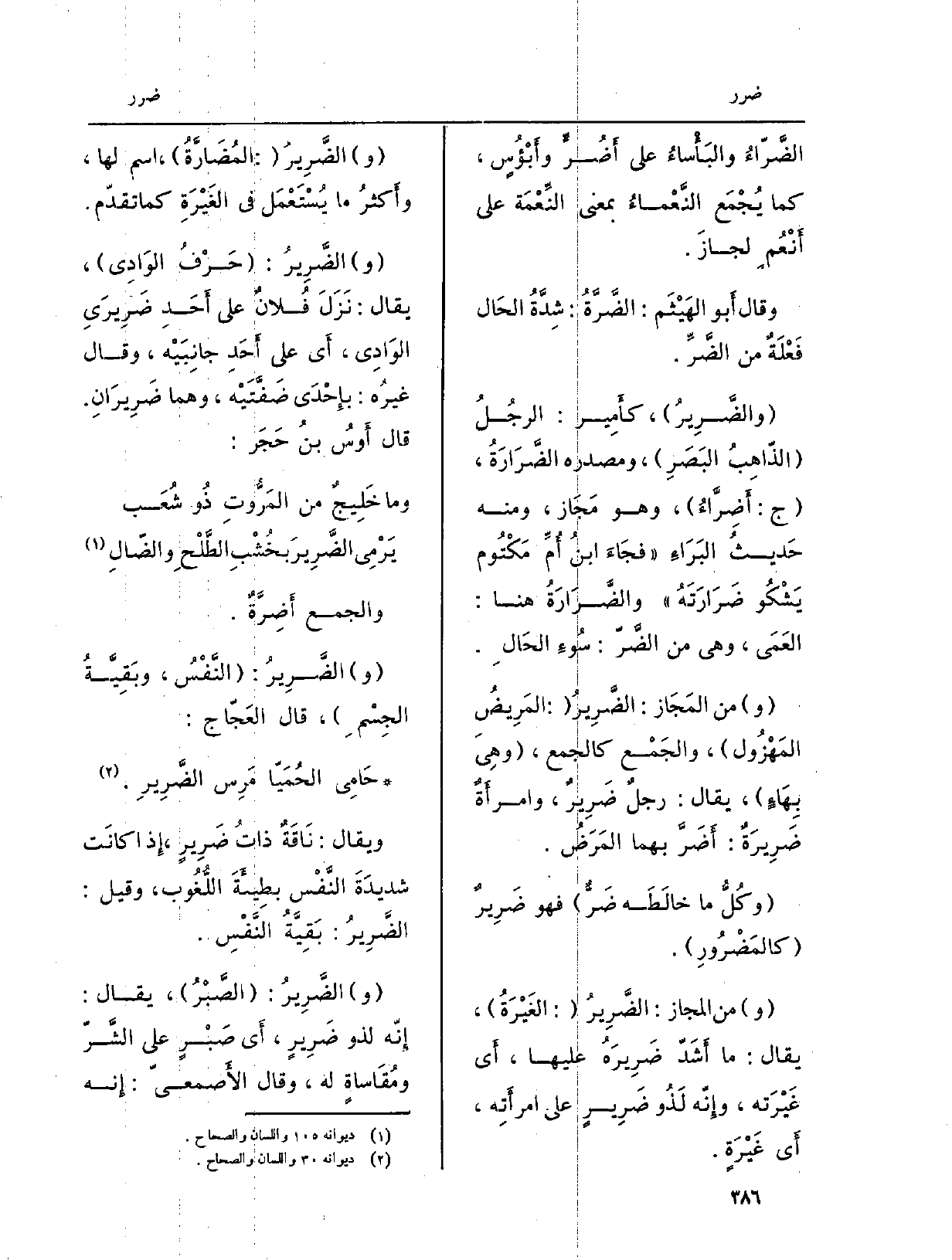 (و) الضَّرِيرُ: ( {المُضَارَّةُ) ، اسْم لَهَا، وأَكثرُ مَا يُسْتَعْمَل فِي الغَيْرَةِ كَمَا تقدّم.