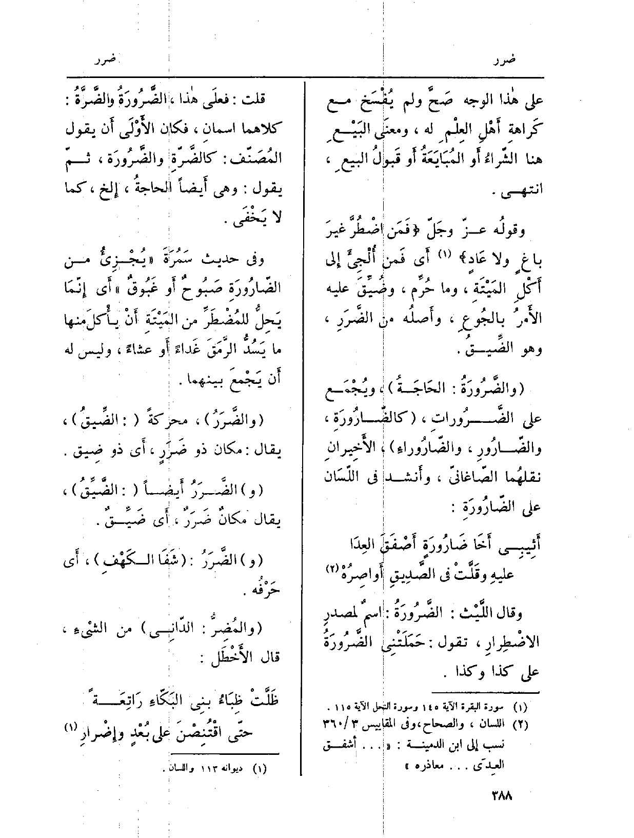 وقولُه عزّ وجلّ: {فَمَنِ {اضْطُرَّ غَيْرَ بَاغٍ وَلاَ عَادٍ} (الْبَقَرَة: 45) ، أَي فَمن أُلْجِىءَ إِلى أَكْلِ المَيْتَةِ، وَمَا حُرِّم، وضُيِّقَ عَلَيْهِ الأَمرُ بالجُوعِ، وأَصلُه من} الضَّرَرِ، وَهُوَ الضِّيقُ.