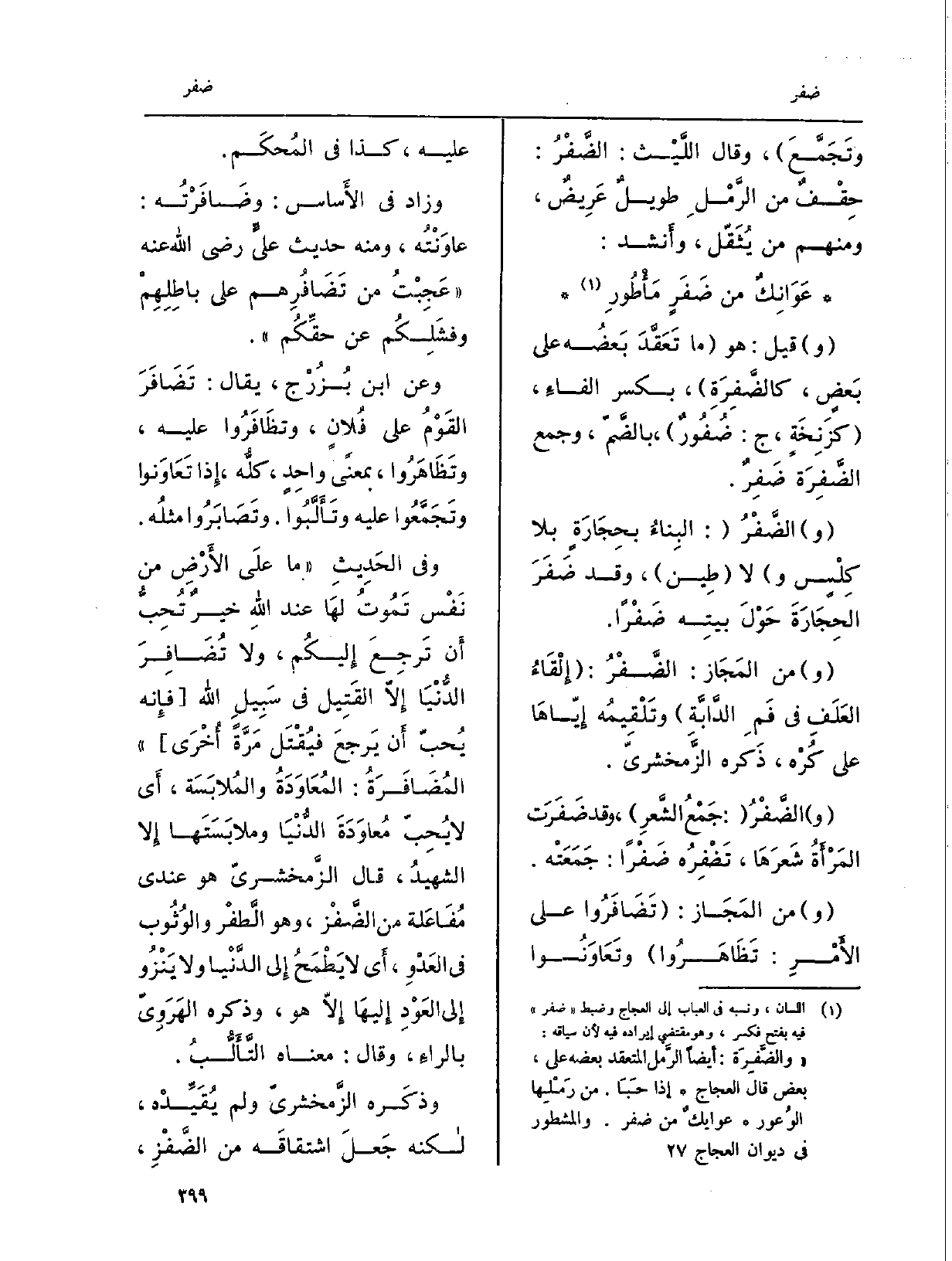 وَفِي الحَدِيثِ: (مَا علَى الأَرْضِ من نَفْس تَمُوتُ لهَا عِنْد اللَّهِ خيرٌ تُحِبُّ أَن تَرجِعَ إِليكُم، وَلَا تُضَافِرَ الدُّنْيَا إِلاّ القَتِيل فِي سَبِيلِ اللَّهِ فإِنه يُحِبّ أَن يَرجعَ فيُقْتَل مَرَّةً أُخْرَى) المُضَافَرَةُ: المُعَاوَدَةُ والمُلابَسَة، أَي لَا يُحِبّ مُعَاوَدَةَ الدُّنْيَا وملابَسَتَها إِلا الشهيدُ، قَالَ الزَّمخشريّ هُوَ عِنْدِي مُفَاعَلة من الضَّفْز، وَهُوَ الطَّفْر والوُثُوب فِي العَدْوِ، أَي لَا يَطْمَحُ إِلى الدَّنْيا وَلَا يَنْزُو إِلى العَوْدِ إِليهَا إِلاّ هُوَ، وَذكره الهَرَوِيّ بالراءِ، وَقَالَ: مَعْنَاهُ التَّأَلُّبُ.