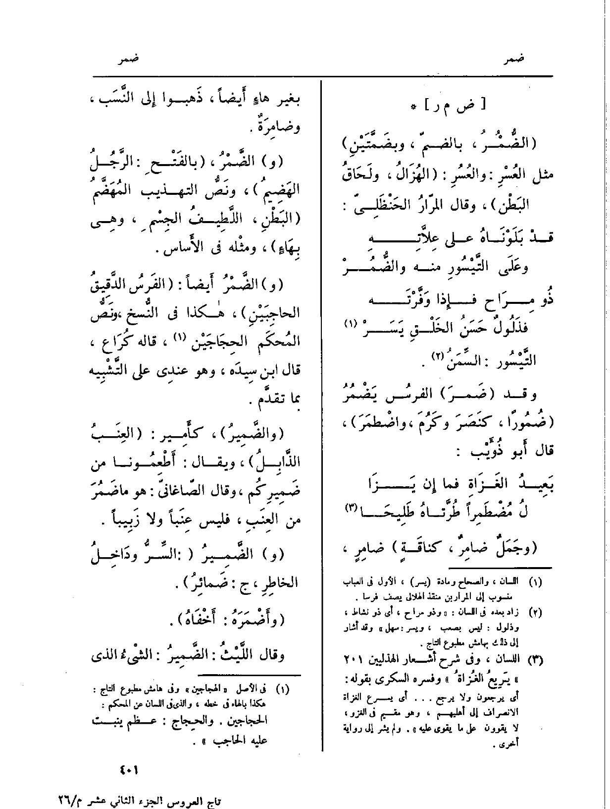 : (الضُّمْرُ، بالضمّ، وبضَمَّتَيْنِ) مثل العُسْرِ، والعُسُرِ: (الهُزَالُ، ولَحَاقُ البَطْن) ، وَقَالَ المرّارُ الحَنْظَلِيّ: