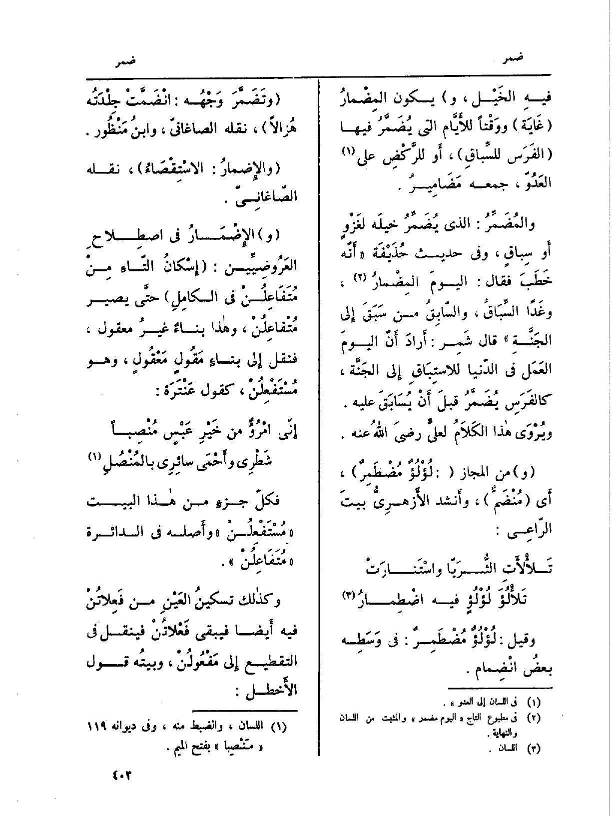 (و) الإِضْمَارُ فِي اصطِلاحِ العَرُوضِيِّين: (إِسْكَانُ التّاءِ مِنْ مُتَفَاعِلُنْ فِي الكامِلِ) حتَّى يصير مُتَفاعِلُنْ، وهاذا بناءٌ غيرُ مَعْقُول، فَنقل ابى بناءٍ مَقُولٍ مَعْقُولٍ، وَهُوَ مُسْتَفْعِلُنْ، كَقَوْل عَنْتَرَة: