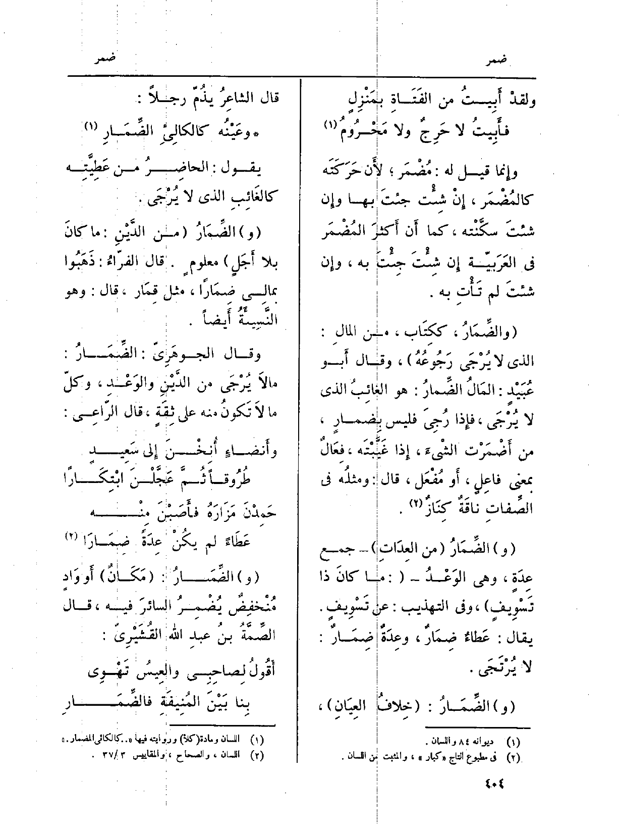 وَقَالَ الجوهَرِيّ: الضِّمَارُ: مَا لاَ يُرْجَى من الدَّيْنِ والوَعْدِ، وكلّ مَا لَا تَكونُ مِنْهُ على ثِقَةٍ، قَالَ الرّاعِي: