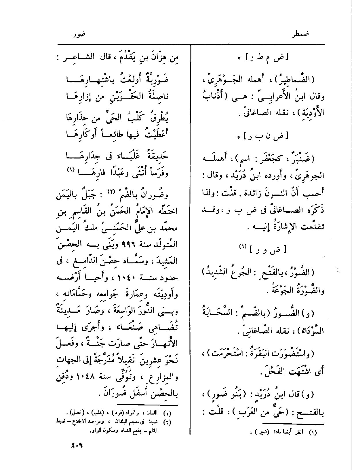 ! وضُورانُ بالضَّمّ: جَبَلٌ باليَمَن اختَطّه الإِمَامُ الحَسَنُ بنُ القَاسِمِ بنِ محمّد بن عليَ الحَسَنِيّ ملكُ اليَمنِ المُتولّد سنة 996 وبَنَى بِهِ الحِصْنَ المَشِيدَ، وسَمَّاه حِصْنَ الدّامِغ، فِي حُدُود سنة 1040، وأَحيا أَرْضه وأَودِيَتَه وعِمَارةَ جَوامِعِه وحَمَّامَاتِه، وَبنى الدُّورَ الوَاسِعَةَ، وصَارَ مَدِينَةً تُضَاهِي صَنْعَاءَ، وأَجرَى إِليها الأَنهارَ حتّى صارَت جَنَّةً، وفَعلَ نَحْوَ عِشْرينَ نَقِيلاً مُدَرَّجَةً إِلى الجهاتِ والمِزارِعِ، وتُوُفِّي سنة 1048 ودُفِن بالحِصْن أَسفَل ضُورَانَ.