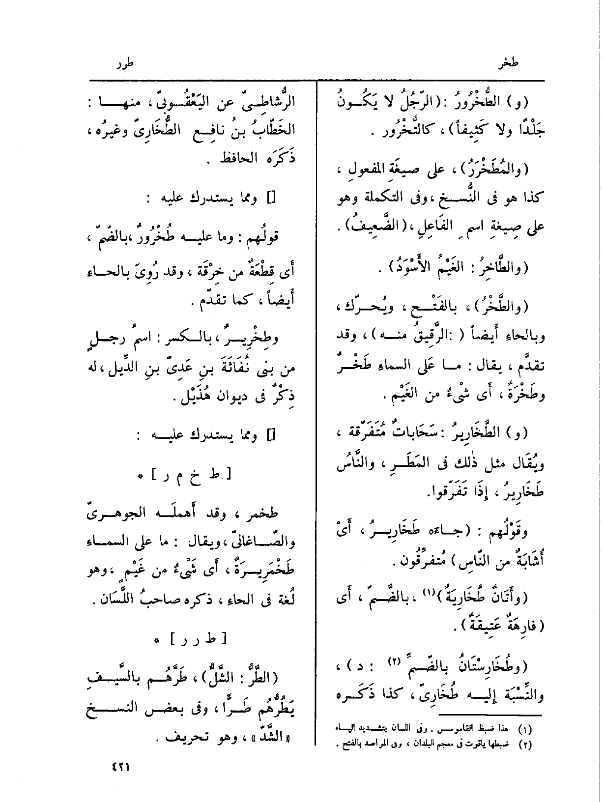 قولُهم: وَمَا عَلَيْهِ طُخْرُورٌ، بالضّمّ، أَي قِطْعَةٌ من خِرْقَة، وَقد رُوِيَ بالحاءِ أَيضاً. كَمَا تقدّم.