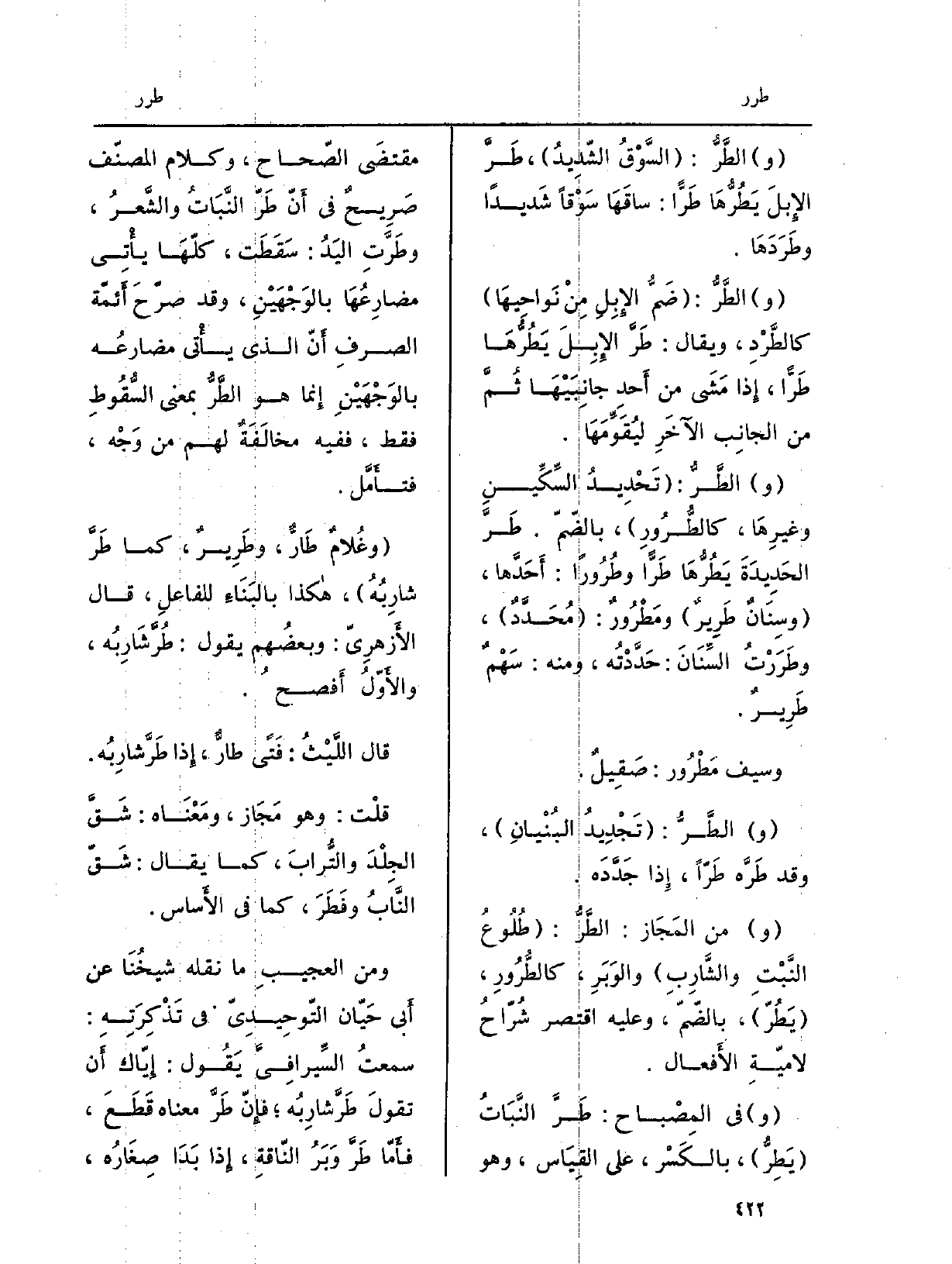 (و) من المَجَاز: {الطَّرُّ: (طُلُوعُ النَّبْتِ والشَّارِبِ) والوَبَرِ،} كالطُّرُورِ، ( {يَطُرّ) ، بالضّمّ، وَعَلِيهِ اقْتصر شُرّاحُ لاميّةِ الأَفعال.