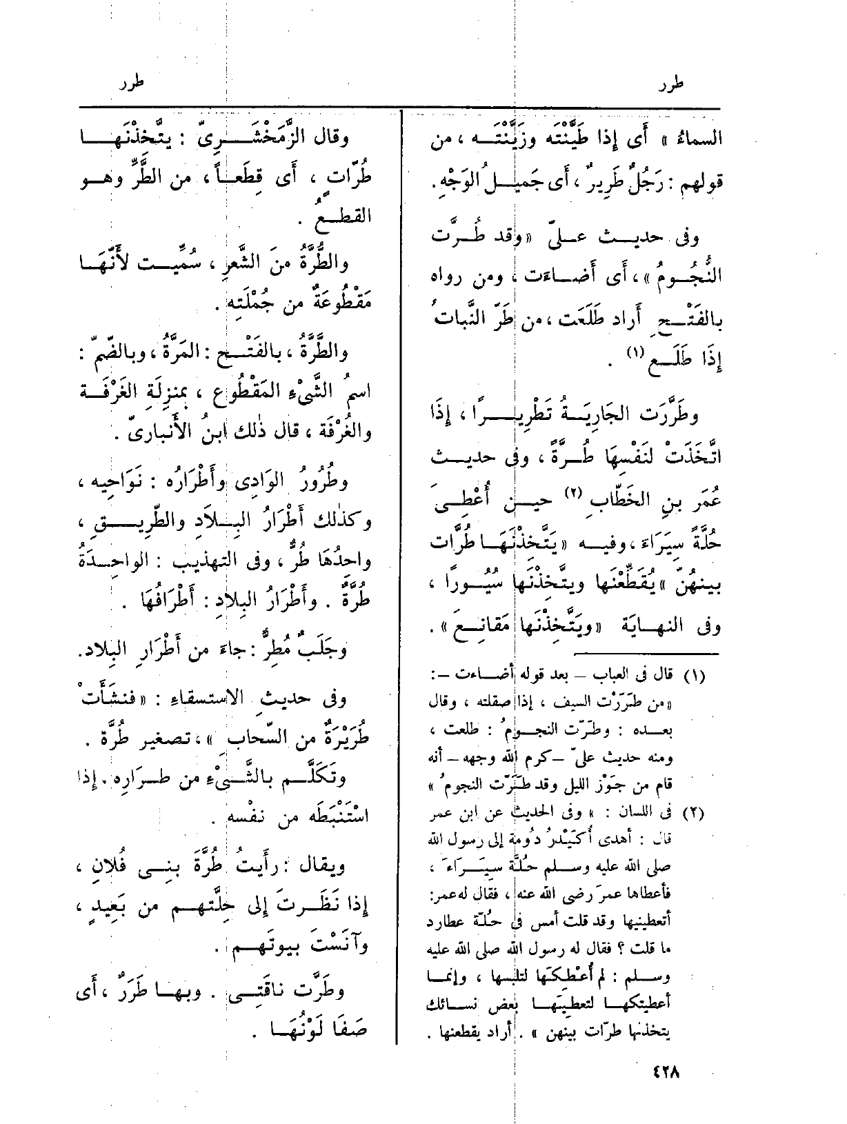 وَقَالَ الزَّمَخْشَرِيّ: يتَّخِذْنَها} طُرّاتٍ، أَي قِطَعاً، من {الطَّرِّ وَهُوَ القطعُ.
