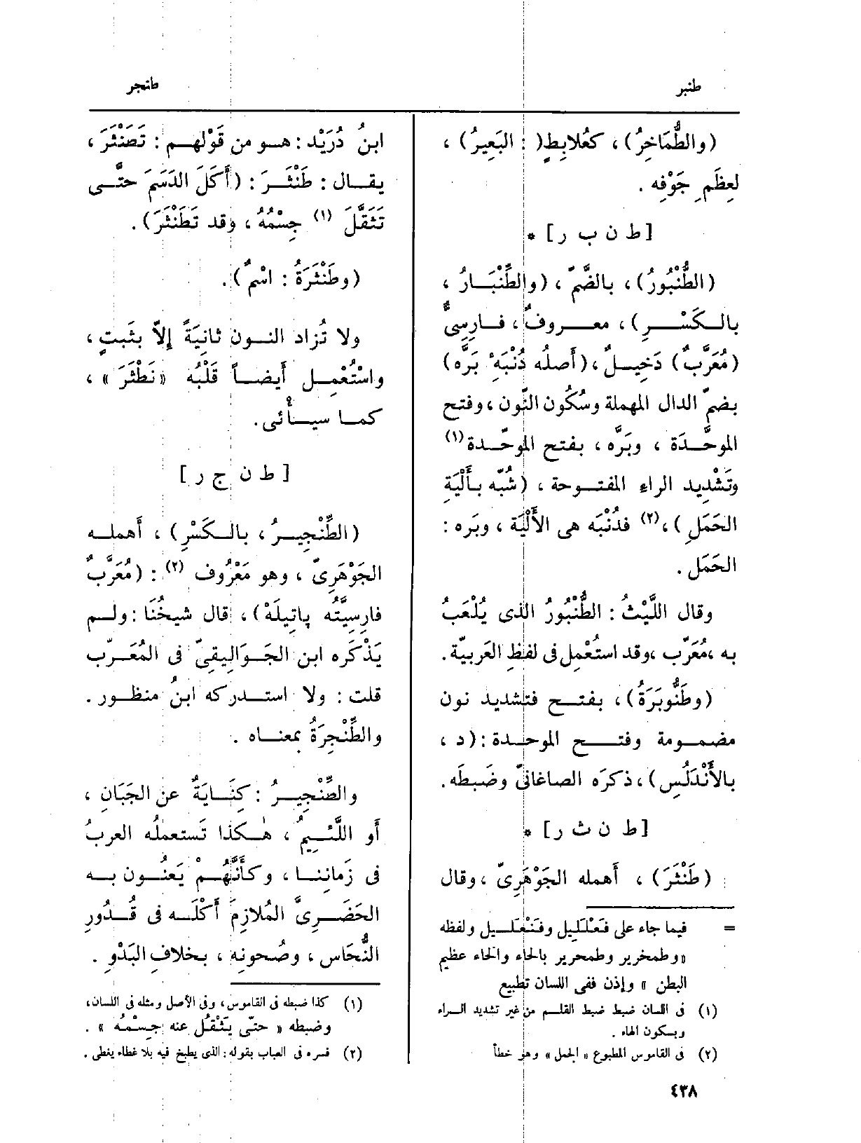 : (الطُّنْبُورُ) ، بالضَّمّ، (والطِّنْبَارُ، بالكَسْرِ) ، معروفٌ، فارِسِيٌّ (مُعَرَّبٌ) دَخِيلٌ، (أَصلُه دُنْبَهِ بَرَّه) بضمّ الدَّال الْمُهْملَة وسُكُون النّون، وَفتح الموحَّدَة، وبَرَّه، بِفَتْح الموحّدة وتَشْدِيد الراءِ الْمَفْتُوحَة، (شُبّه بأَلْيَةِ الحَمَلِ) ، فدُنْبَه هِيَ الأَلْيَة، وبَره: الحَمَل.