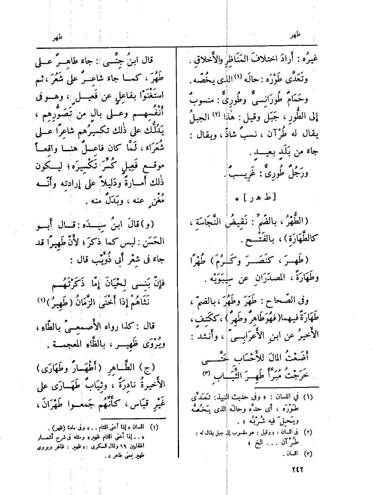 (و) قالَ ابنُ سِيدَه: قَالَ أَبو الحَسَن: لَيْسَ كَمَا ذكرَ؛ لأَنّ طَهِيراً قد جاءَ فِي شِعْر أَبي ذُؤَيْب قَالَ: