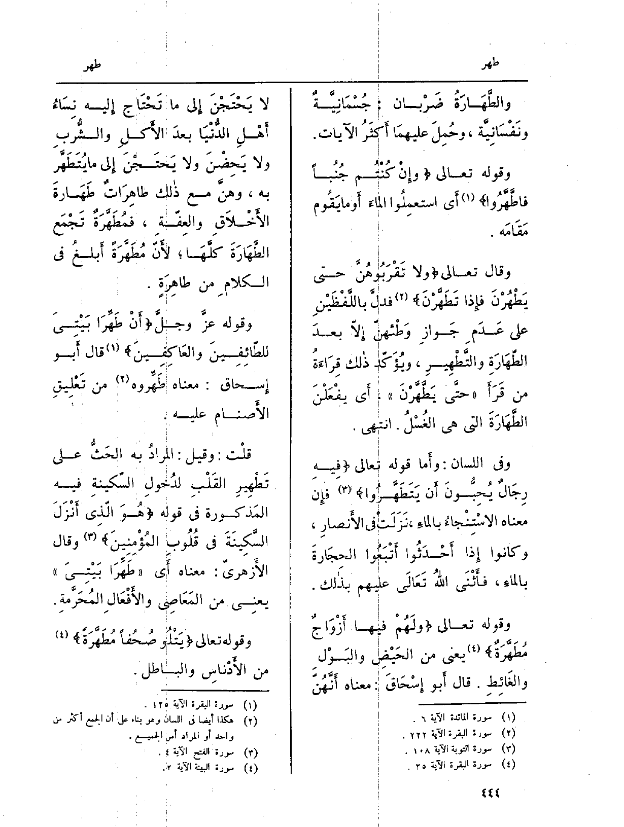 وَقَالَ تَعَالَى: {وَلاَ تَقْرَبُوهُنَّ حَتَّى يَطْهُرْنَ فَإِذَا تَطَهَّرْنَ} (الْبَقَرَة: 222) ، فدلَّ باللَّفْظَيْنِ على عَدَمِ جَوازِ وَطْئهنّ إِلاّ بعدَ الطّهَارَةِ والتَّطْهِيرِ، ويُؤكّد ذالك قِرَاءَةُ من قَرَأَ: (حتَّى يَطَّهَّرْنَ) ، أَي يَفْعَلْنَ الطَّهَارَةَ الَّتِي هِيَ الغُسْلُ. انْتهى.