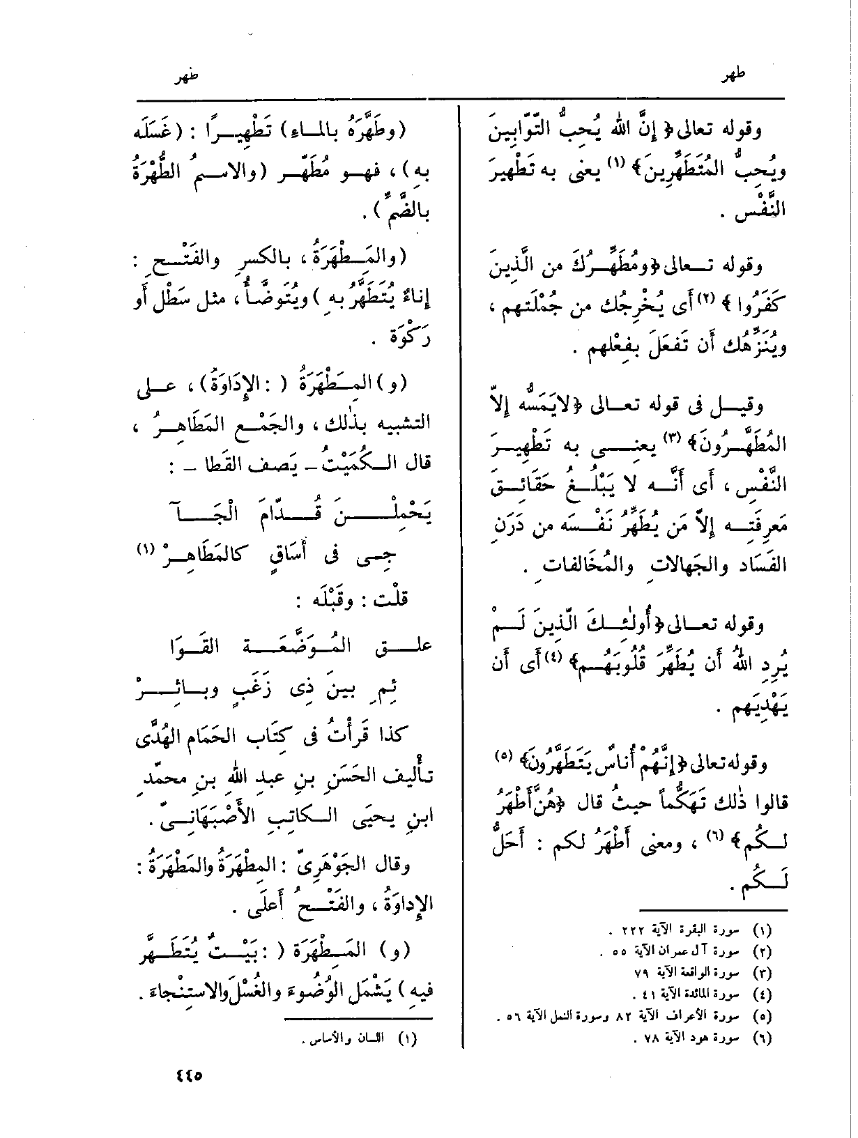 وَقيل فِي قَوْله تَعَالَى: {لاَّ يَمَسُّهُ إِلاَّ الْمُطَهَّرُونَ لله} (الْوَاقِعَة: 79) ، يعنِي بِهِ تَطْهِيرَ النَّفْسِ، أَي أَنَّه لَا يَبْلُغُ حَقَائِقَ مَعرِفَتِه إِلاّ مَن يُطَهِّرُ نَفْسَه من دَرَنِ الفَسَاد والجَهالاتِ والمُخَالفاتِ.