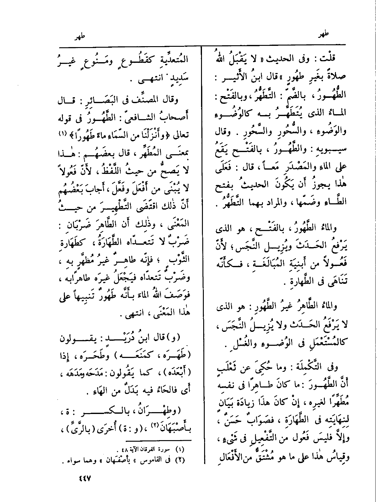 وَقَالَ المصنِّف فِي البَصَائِرِ: قَالَ أَصحابُ الشافعيّ: الطَّهُورُ فِي قَوْله تَعَالَى: {وَأَنزَلْنَا مِنَ السَّمَآء مَآء طَهُوراً} (الْفرْقَان: 48) ، بمعنَى المُطَهِّر، قَالَ بعضَهُم: هاذا لَا يَصحُّ من حيثُ اللَّفْظُ، لأَنّ فَعُولاً لَا يُبْنَى من أَفْعَلَ وفَعَّلَ، أَجابَ بَعْضُهُم أَنّ ذالك اقتَضَى التَّطْهِيرَ من حيثُ المَعْنَى، وذالِك أَن الطَّاهِرَ ضَرْبَانِ: ضَرْبٌ لَا تَتَعدّاه الطَّهَارَةُ، كطَهَارةِ الثَّوْبِ؛ فإِنّه طاهِرٌ غيرُ مُطهَّرٍ بهِ، وضَرْبٌ تَتعدّاه فيَجْعَلُ غيرَه طَاهِرا بِهِ، فوَصَفَ اللَّهُ الماءَ بأَنَّه طَهُورٌ تَنبِيهاً على هاذا المَعْنَى، انْتهى.