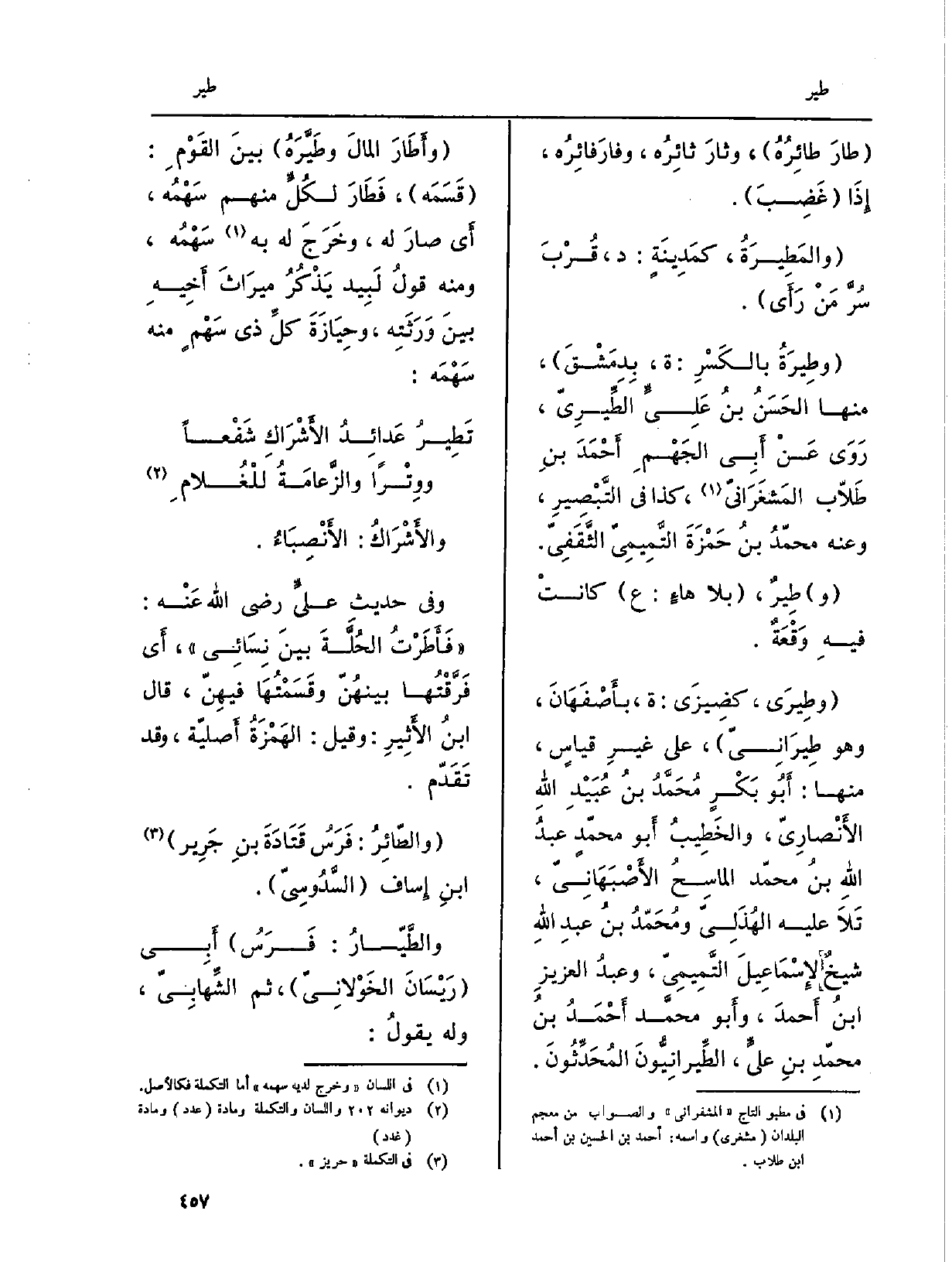 (} وأَطَارَ المالَ {وطَيَّرَهُ) بينَ القَوْمِ: (قَسَمَه) ، فَطَارَ لكُلَ مِنْهُم سَهْمُه، أَي صارَ لَهُ، وخَرَجَ لَهُ بِهِ سَهْمُه، وَمِنْه قولُ لَبِيد يَذْكُرُ ميرَاثَ أَخِيهِ بينَ وَرَثَتِه، وحِيَازَةَ كلِّ ذِي سَهْمٍ مِنْهُ سَهْمَه: