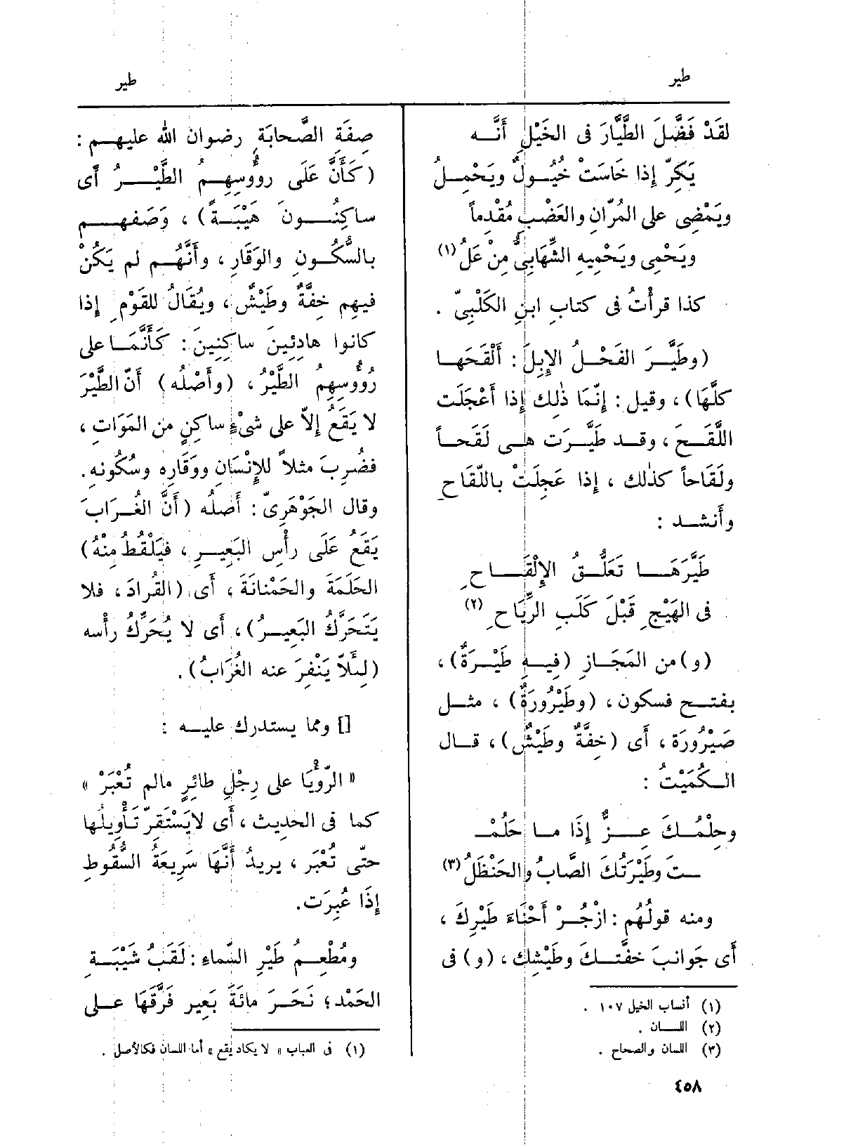 وَمِنْه قولُهُم: ازْجُرِ أَحْنَاءَ} طَيْرِكَ، أَي جَوانِبَ خِفَّتِكَ وطَيْشِك، (و) فِي صِفَةِ الصَّحابَةِ، رضوَان الله عَلَيْهِم: (كَأَنَّ عَلَى رخؤُوسِهِمُ الطَّيْرُ أَي ساكِنُونَ هَيْبَةً) ، وَصَفهم بالسُّكُونِ والوَقَارِ، وأَنَّهُم لم يَكُنْ فيهِم خِفَّةٌ وطَيْشٌ، ويُقَالُ للقَوْمِ إِذا كَانُوا هادِئِينَ ساكِنِينَ: كَأَنَّمَا على رُؤُوسِهِمُ الطَّيْرُ، (وأَصْلُه) أَنّ {الطَّيْرَ لَا يَقَعُ إِلاّ على شيْءٍ ساكِنٍ من المَوَاتِ، فضُرِبَ مثلا للإِنْسَانِ ووَقَارِه وسُكُونِه. وَقَالَ الجَوْهَرِيّ: أَصلُه (أَنَّ الغُرَابَ يَقَعُ عَلَى رأْسِ البَعِيرِ، فيَلْقُطُ مِنْهُ) الحَلَمَةَ والحَمْنانَةَ، أَي (القُرادَ، فَلَا يَتَحَرَّكُ البَعِيرُ) ، أَي لَا يُحَرِّكُ رأْسه (لِئَلاّ يَنْفِرَ عَنهُ الغُرَابُ) .