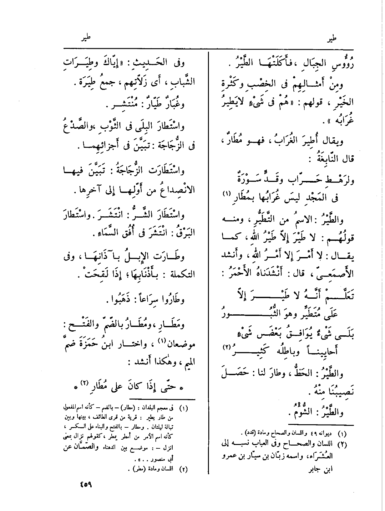 وَالطير: الِاسْم من {التَّطَيُّرِ، وَمِنْه قَوْلهم: لَا} طَيْرَ إِلَّا {طَيْرُ الله، كَمَا يُقَال: لَا امْر إِلَّا أَمر الله، وَأنْشد الْأَصْمَعِي، قَالَ: أنشدناه الْأَحْمَر: تعلم أَنه لَا} طَيْرَ إِلَّا على {مُتَطَيَّر وَهُوَ الثبور بلَى شئ يُوَافق بعض شئ أحايينا وباطلة كثير} والطَّيْرُ: الْحَظ، وطار لنا: حصل نصيبنا مِنْهُ. {والطَّيْرُ: الشؤم.