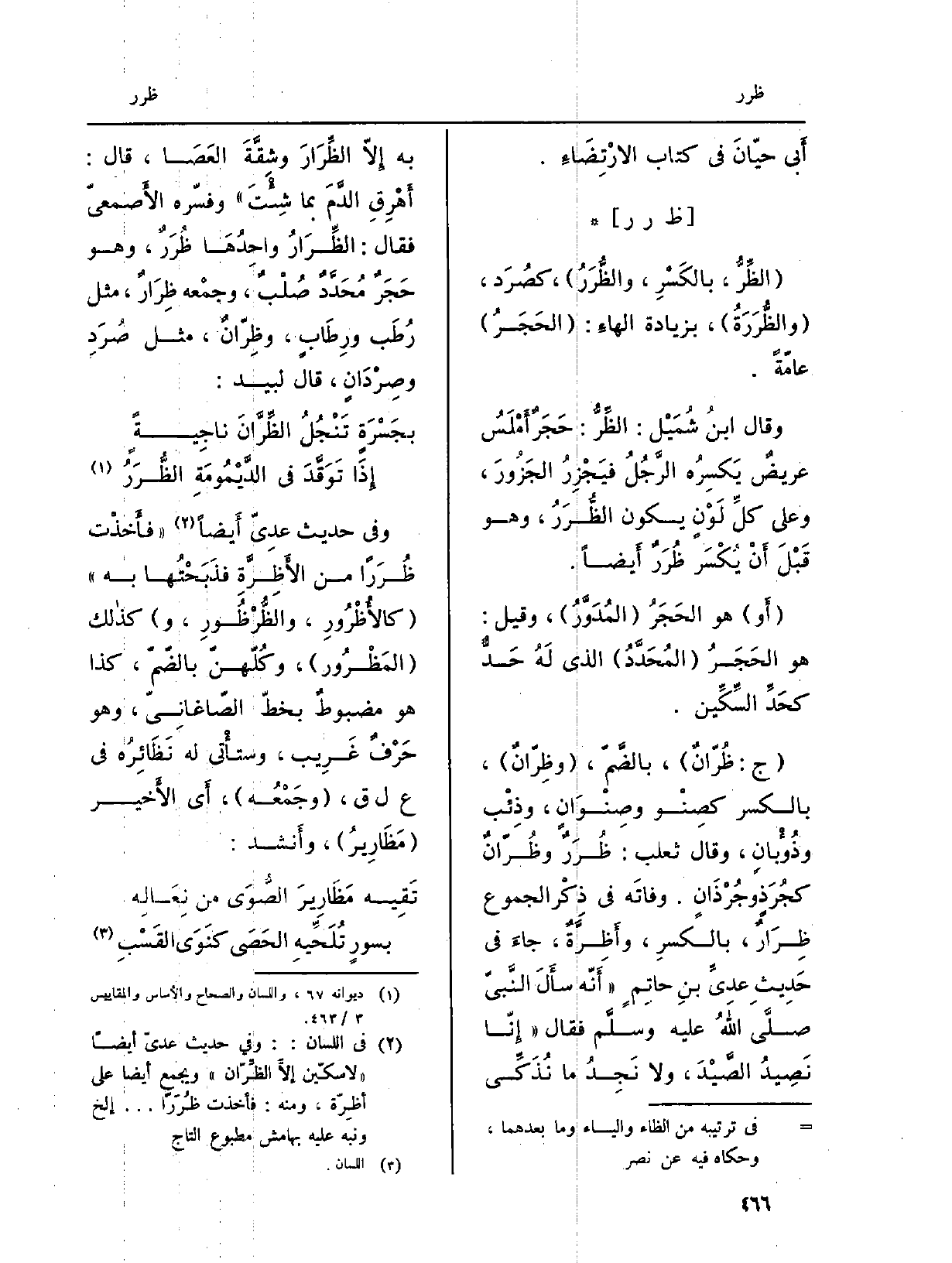 (ج: {ظُرّانٌ) ، بالضَّمّ، (} ظِرّانٌ) ، بِالْكَسْرِ كصِنْو وصِنْوَانٍ، وذِئْب وذُؤْبانٍ، وَقَالَ ثَعْلَب: {ظُرَرٌ} وظُرّانٌ كجُرَذٍ وجُرْذَانٍ. وفاتَه فِي ذِكْر الجموع {ظِرَارٌ، بالكسرِ، وأَظِرَّةٌ، جاءَ فِي حَدِيثِ عديِّ بنِ حاتِمٍ: (أَنّه سأَلَ النَّبيّ صلى الله عَلَيْهِ وسلمفقال: إِنّا نَصِيدُ الصَّيْدَ، وَلَا نَجِدُ مَا نُذَكِّي بِهِ إِلاّ} الظِّرَارَ وشِقَّةَ العَصَا، قَالَ: أَهْرِقِ الدَّمَ بِمَا شِئْتَ) . وفسّره الأَصمعيّ فَقَالَ: الظِّرَارُ واحِدُها {ظُرَرٌ، وَهُوَ حَجَرٌ مُحَدَّدٌ صُلْبٌ، وجمْعه} ظِرَارٌ، مثل رُطَب ورِطَابٍ، {وظِرّانٌ، مثل صُرَدٍ وصِرْدَانٍ، قَالَ لبيد: