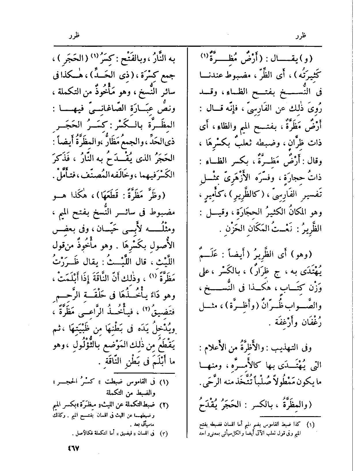 (} والمِظَرَّةُ، بِالْكَسْرِ: الحَجَرُ يُقْدَحُ بِهِ النَّارُ، وبالفَتْح: كِسَرُ الحَجَرِ) ، جمع كِسْرَة، (ذِي الحَدِّ) ، هاكذا فِي سَائِر النُّسخ، وَهُوَ مَأْخُوذٌ من التكملة، ونصُّ عِبَارَةِ الصّاغانِيّ فِيهَا: {المِظَرَّة بالكَسْر: كِسَرُ الحَجَرِ ذِي الحَدِّ، والجمعُ} مَظَارُّ، {والمِظَرَّةُ أَيضاً: الحَجَرُ الَّذِي يُقْدَحُ بِهِ النّارُ، فَذَكَرَ الكَسْرَ فيهمَا، وخَالَفه المُصنّف، فتأَمَّلْ.