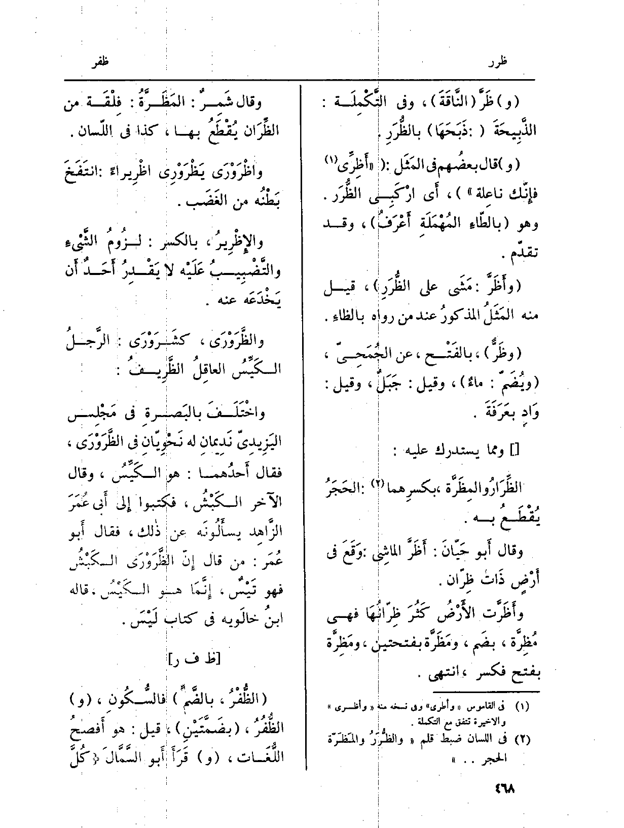 ( {وأَظَرَّ: مَشَى على} الظُّرَرِ) ، قيل مِنْهُ المَثَلُ المذكورُ عِنْد من رَوَاهُ بالظاءِ.