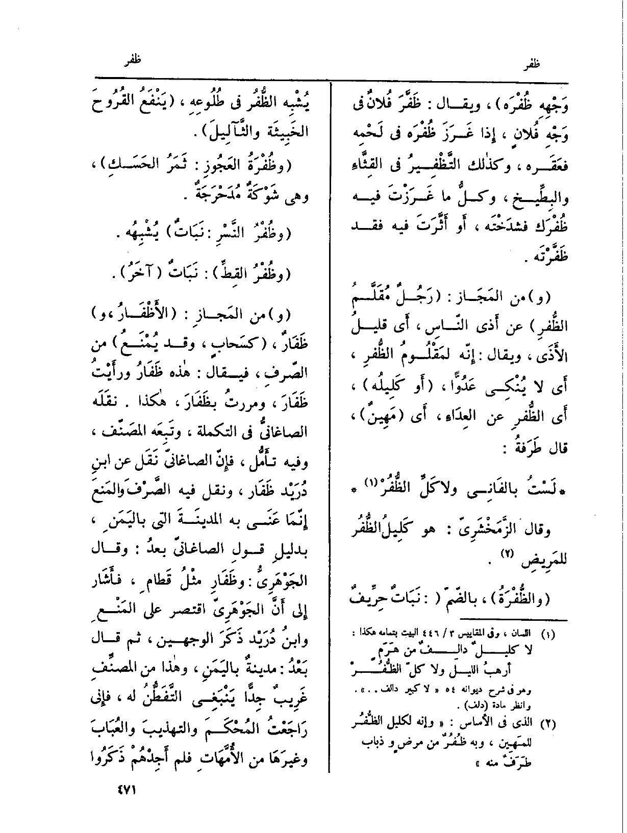 (و) من المَجازِ: (الأَظْفَارُ، و) ظَفَارٌ، (كسَحَابٍ، وَقد يُمْنَعُ) من الصّرفِ، فَيُقَال: هاذه ظَفَارُ ورأَيْتُ ظَفَارَ، ومررتُ بظَفَارَ، هاكذا. نقَلَه الصاغانيُّ فِي التكملة، وتَبِعَه المصَنّف، وَفِيه تأَمُّل، فإِنّ الصاغانيّ نَقَل عَن ابنِ دُرَيْد ظَفَار، وَنقل فِيهِ الصَّرْفَ والمَنعَ إِنّمَا عَنَى بِهِ المدينَةَ الَّتِي باليَمَنِ، بدليلِ قولِ الصاغانيّ بعدُ: وَقَالَ الجَوْهَرِيُّ: وظَفَارِ مثْلُ قَطامِ، فأَشَار إِلى أَنَّ الجَوْهَرِيّ اقْتصر على المَنْعِ وابنُ دُرَيْد ذَكَرَ الْوَجْهَيْنِ، ثمَّ قَالَ بَعْدُ: مدينةٌ باليَمَنِ، وهاذا من المصنِّفِ غَرِيبٌ جِدّاً يَنْبَغِي التَّفَطُّنُ لَهُ، فإِني رَاجَعْتُ المُحْكَمَ والتهذيبَ والعُبَابَ وغيرَهَا من الأُمَّهَاتِ فَلم أَجِدْهُمْ ذَكَرُوا