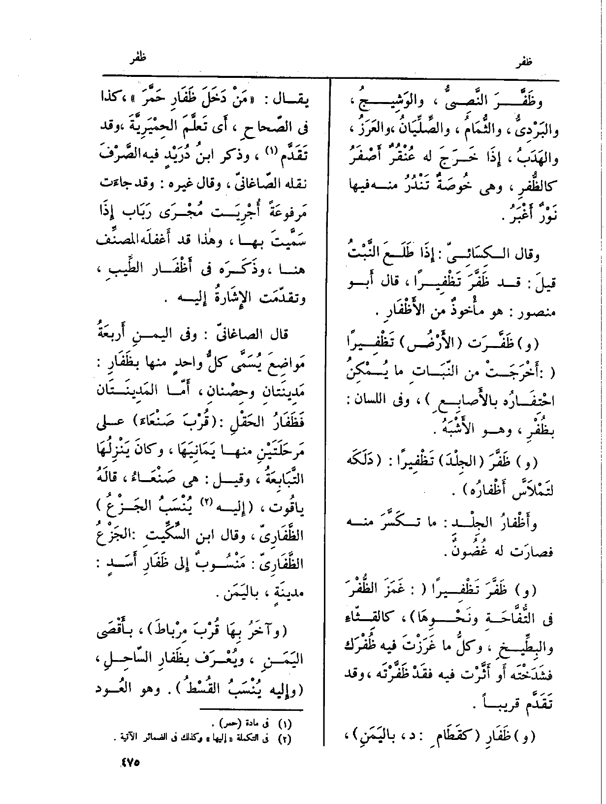 (و) ظَفَارِ (كقَطَامِ: د، باليَمَنِ) ، يُقَال: (مَنْ دَخَلَ ظَفَارِ حَمَّرَ) ، كَذَا فِي الصّحاحِ، أَي تَعلَّمَ الحِمْيَرِيَّةَ، وَقد تَقَدَّم، وَذكر ابنُ دُرَيْدٍ فِيهِ الصَّرْفَ نَقله الصّاغانيّ، وَقَالَ غَيره: وَقد جاءَت مَرفوعَةً أُجْرِيَت مُجْرَى رَبَاب إِذَا سَمَّيتَ بهَا، وهاذا قد أَغفلَه المصنِّف هُنَا، وذَكَرَه فِي أَظْفَار الطِّيبِ، وتقدّمَت الإِشَارةُ إِليه.