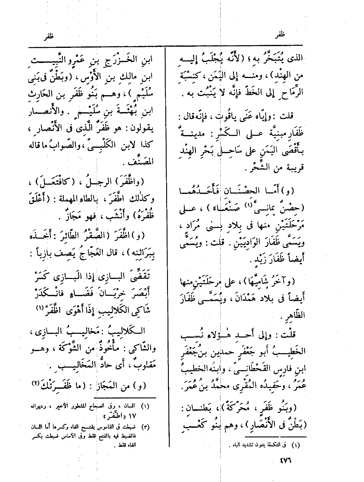 (وبَنُو ظَفَرٍ، مُحَرّكَةً) ، بَطنانٍ: (بَطْنٌ فِي الأَنْصَارِ) ، وهم بنُو كَعْبِ بنِ الخَزْرَجِ بنِ عَمْرٍ والنَّبِيتِ بنِ مالِكِ بنِ الأَوْسِ، (وبَطْنٌ فِي بَنِي سُلَيْمٍ) ، وهم بَنُو ظَفَرِ بن الحَارِثِ بنِ بُهْثَةَ بنِ سُلَيْمٍ. والأَنصار يَقُولُونَ: هُوَ ظَفَرٌ الَّذِي فِي الأَنْصارِ، كَذَا لِابْنِ الكَلْبِيّ، والصّوابُ مَا قَالَه المصَنَّف.