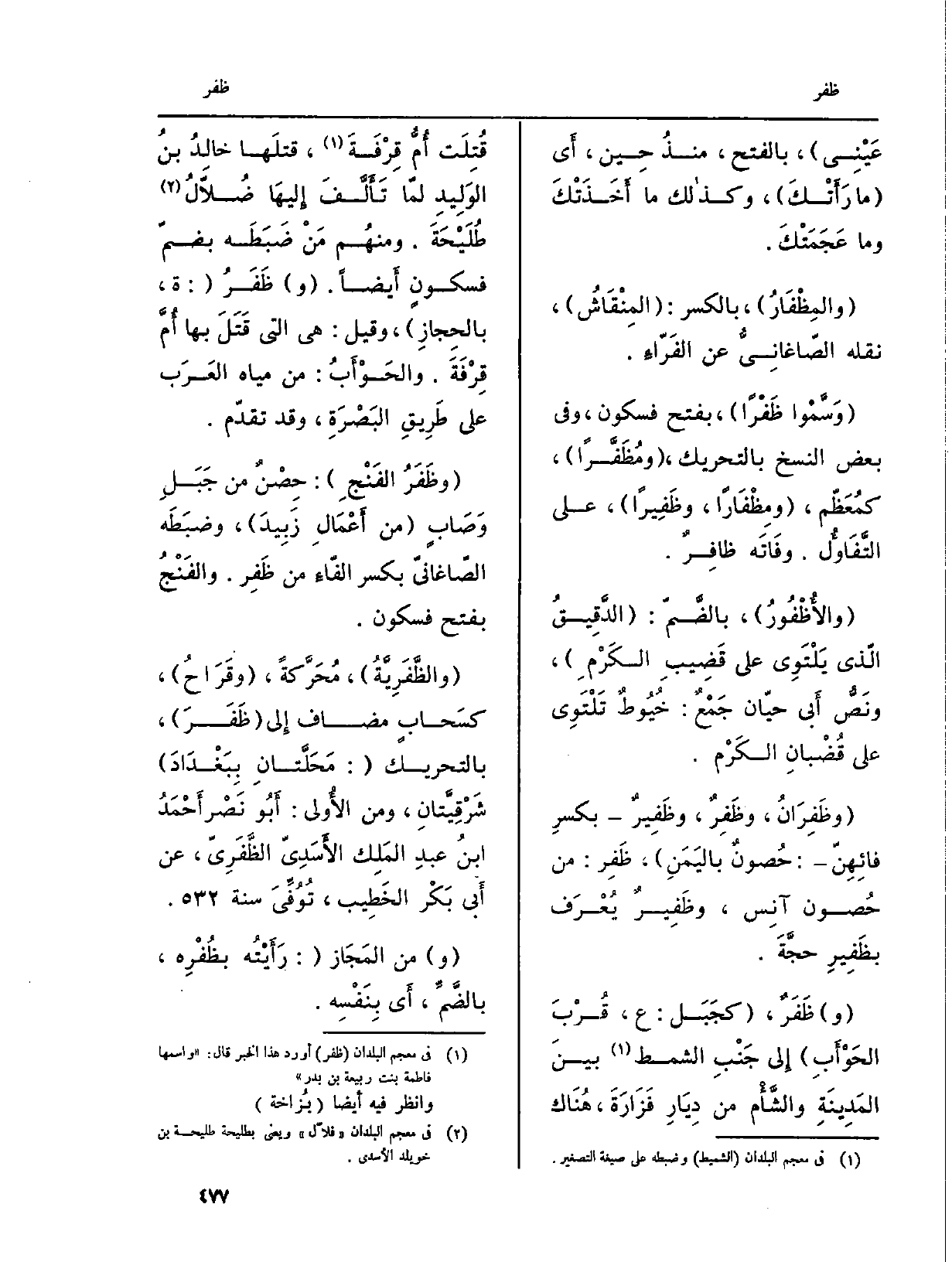 (والظَّفَرِيَّةُ) ، مُحَرَّكةً، (وقَرَاحُ) ، كسَحابٍ مُضَاف إِلى (ظَفَرَ) ، بِالتَّحْرِيكِ: (مَحَلَّتانِ ببَغْدَادَ) شَرْقِيَّتانِ، وَمن الأُولى: أَبُو نَصْر أَحْمَدُ بنُ عبدِ المَلِك الأَسَدِيّ الظَّفَرِيّ، عَن أَبي بَكْر الخَطِيب، تُوُفِّيَ سنة 32.