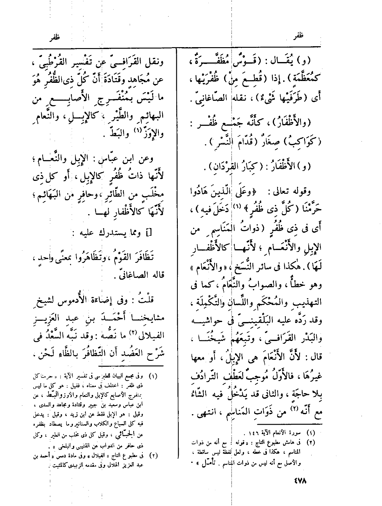 وَقَوله تَعَالَى: {وَعَلَى الَّذِينَ هَادُواْ حَرَّمْنَا كُلَّ ذِى ظُفُرٍ} (الْأَنْعَام: 146) ، دَخَلَ فيهِ) ، أَي فِي ذِي طُفُرٍ (ذواتُ المَنَاسِمِ من الإِبِلِ والأَنْعَامِ؛ لأَنّها كالأَظْفارِ لَهَا) . هاكذا فِي سَائِر النُّسَخ، (والأَنْعَام) وَهُوَ خطأٌ، والصوابُ والنَّعَامُ، كَمَا فِي التهذيبِ والمُحْكَمِ واللِّسانِ والتَّكْمِلَةِ، وَقد رَدَّه عَلَيْهِ البَلْقِينِيّ فِي حَوَاشِيه والبَدْر القَرافيّ، وتَبِعَهُم شَيخُنَا، قَالَ: لأَنَّ الأَنْعَامَ هِيَ الإِبِلُ، أَو مَعهَا غيرُهَا، فالأَوّلُ مُوجِبٌ لعَطْفِ التّرادُفِ بِلا حاجَةٍ، والثّاني قد يَدْخُلُ فِيهِ الشّاءُ مَعَ أَنّه من ذَوَاتِ المَناسِم. انْتهى. وَنقل القَرَافِيّ عَن تَفْسِير القُرْطُبِيّ، عَن مُجَاهِدٍ وقَتَادَةَ أَنّ كُلّ ذِي الظُّفُرِ هُوَ مَا لَيْسَ بمُنْفَرِجِ الأَصابِعِ من البهائِمِ والطَّيْرِ، كالإِبِلِ، والنَّعامِ، والإِوَزّ والبَطّ.