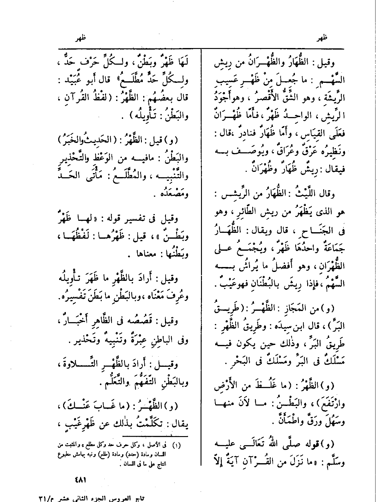 (و) قَوْله صلَّى اللَّهُ تَعَالَى عَلَيْهِ وسَلَّم: (مَا نَزَلَ من القُرْآنِ آيَةٌ إِلاّ لَهَا ظَهْرٌ وبَطْنٌ، ولكُلِّ حَرْفٍ حَدٌّ، ولِكُلِّ حَدَ مُطَّلَعُ) . قَالَ أَبو عُبَيْد: قَالَ بعضُهُم: الظَّهْرُ: (لَفْظُ القُرآنِ، والبَطْنُ: تَأْوِيلُه) .