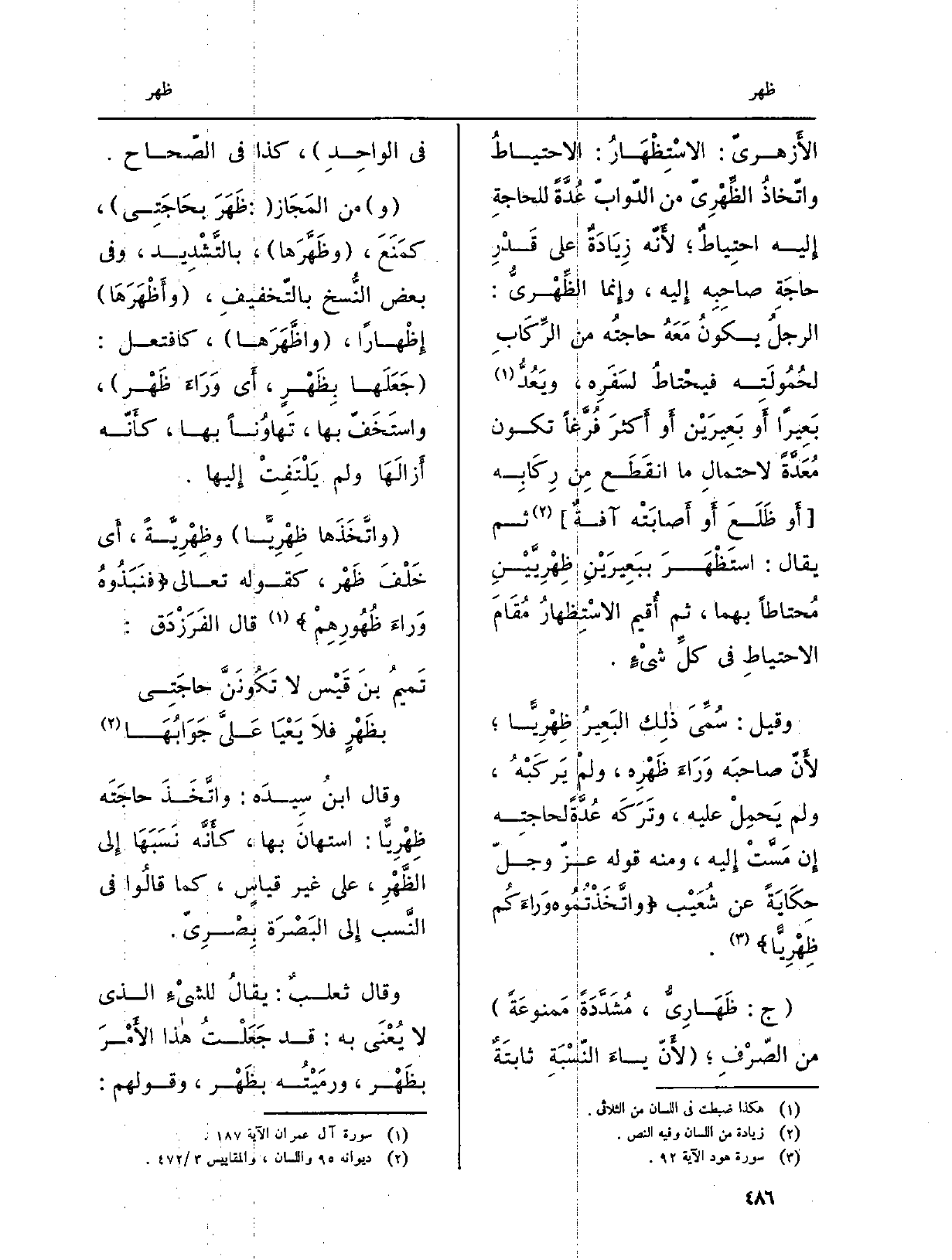 وَقيل: سُمِّيَ ذالِك البَعِيرُ ظِهْرِيّاً، لأنّ صاحبَه وَرَاءَ ظَهْرِه، ولَمْ يَركَبْهُ، وَلم يَحْمِلْ عَلَيْهِ، وتَرَكَه عُدّةً لحاجتِه إِن مَسَّتْ إِليه، وَمِنْه قَوْله عزّ وجلّ حِكَايَةً عَن شُعَيْب: {وَاتَّخَذْتُمُوهُ وَرَآءكُمْ ظِهْرِيّاً} (هود: 92) .