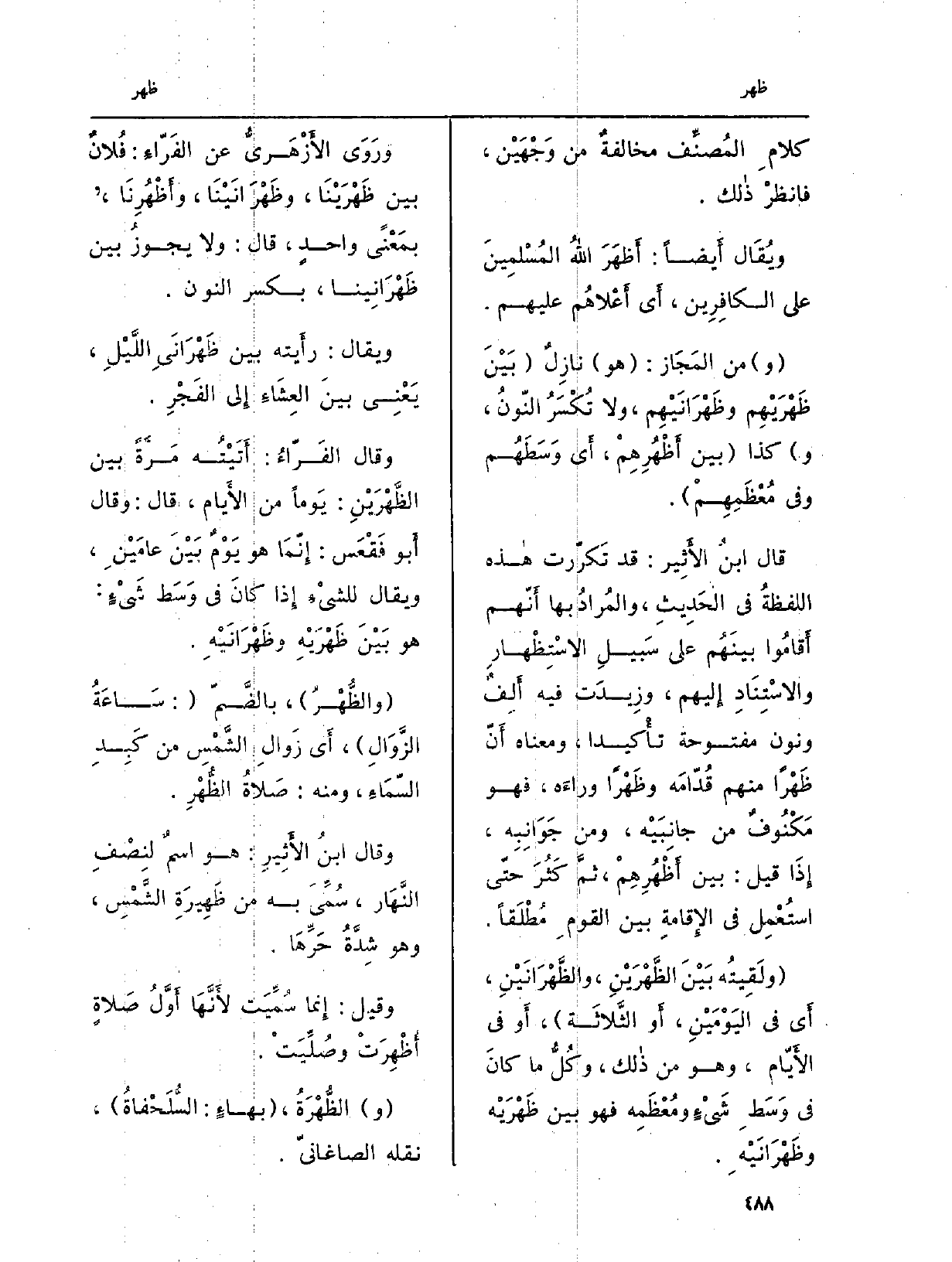(ولَقِيتُه بَيْن الظَّهْرَيْنِ، والظَّهْرَانَيْنِ، أَي فِي اليَوْمَيْنِ، أَو الثَّلاثَة) ، أَو فِي الأَيّام، وَهُوَ من ذالك، وكُلُّ مَا كانَ فِي وَسَطِ شَيْءٍ ومُعْظَمِه فَهُوَ بَين ظَهْرَيْه وظَهْرَانَيْهِ.