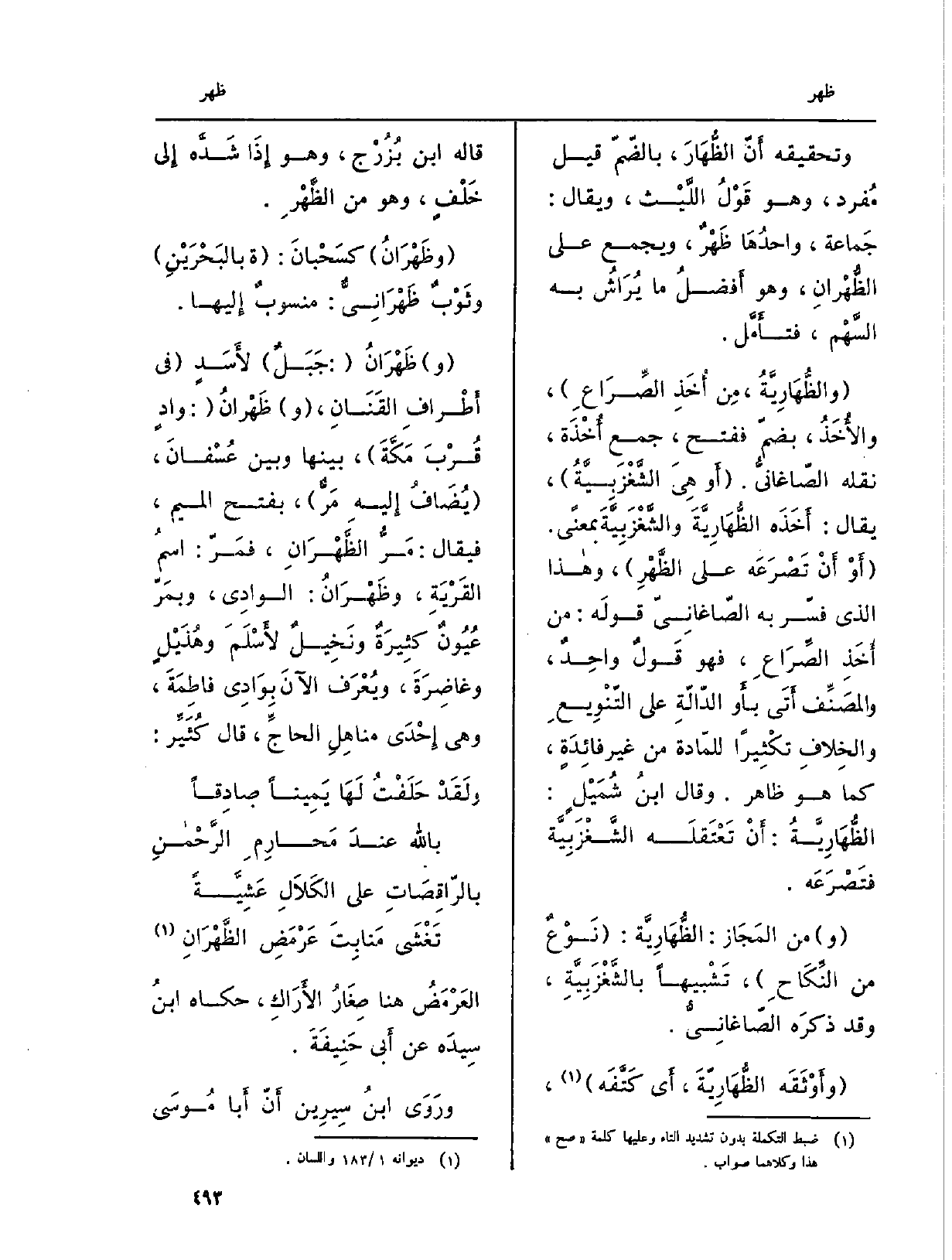 وتحقيقه أَنّ الظُّهَارَ، بالضّمّ قيل مُفرد، وَهُوَ قَوْلُ اللَّيْث، وَيُقَال: جَماعة، واحدُها ظَهْرٌ، وَيجمع على الظُّهْرانِ، وَهُوَ أَفْضلُ مَا يُرَاشُ بِهِ السَّهْم، فتأَمَّل.