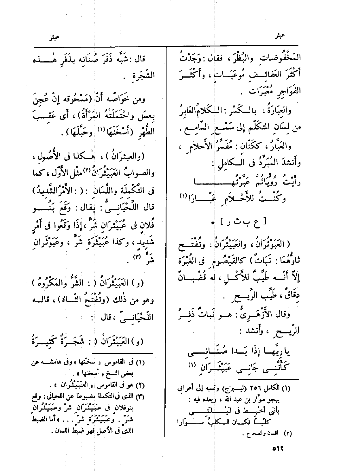 (والعبثرَانُ) ، هاكذا فِي الأُصُولِ، والصوابْ العَبَيْثُرَانُ مثْل الأَوّل، كَمَا فِي التَّكْمِلَةِ واللِّسَانِ: (الأَمْرُ الشَّدِيدُ) قَالَ اللِّحْيَانِيُّ: يُقَال: وَقَعَ بَنُو فُلانٍ فِي عُبَيْثَرانِ شَرَ، إِذَا وَقَعُوا فِي أَمْرٍ شَدِيدٍ، وَكَذَا عُبَيْثَرَةِ شَرَ، وعَبَوْثَرانِ شَرَ.