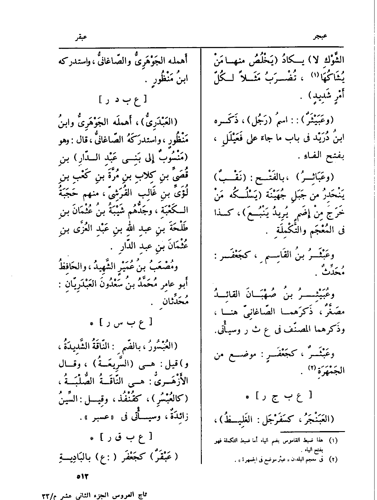 : (العَبَنْجَرُ، كسَفَرْجَل: الغَلِيظُ) ، أَهمله الجَوْهَرِيُّ والصّاغانيُّ، واستدركه ابنُ مَنْظُورٍ.