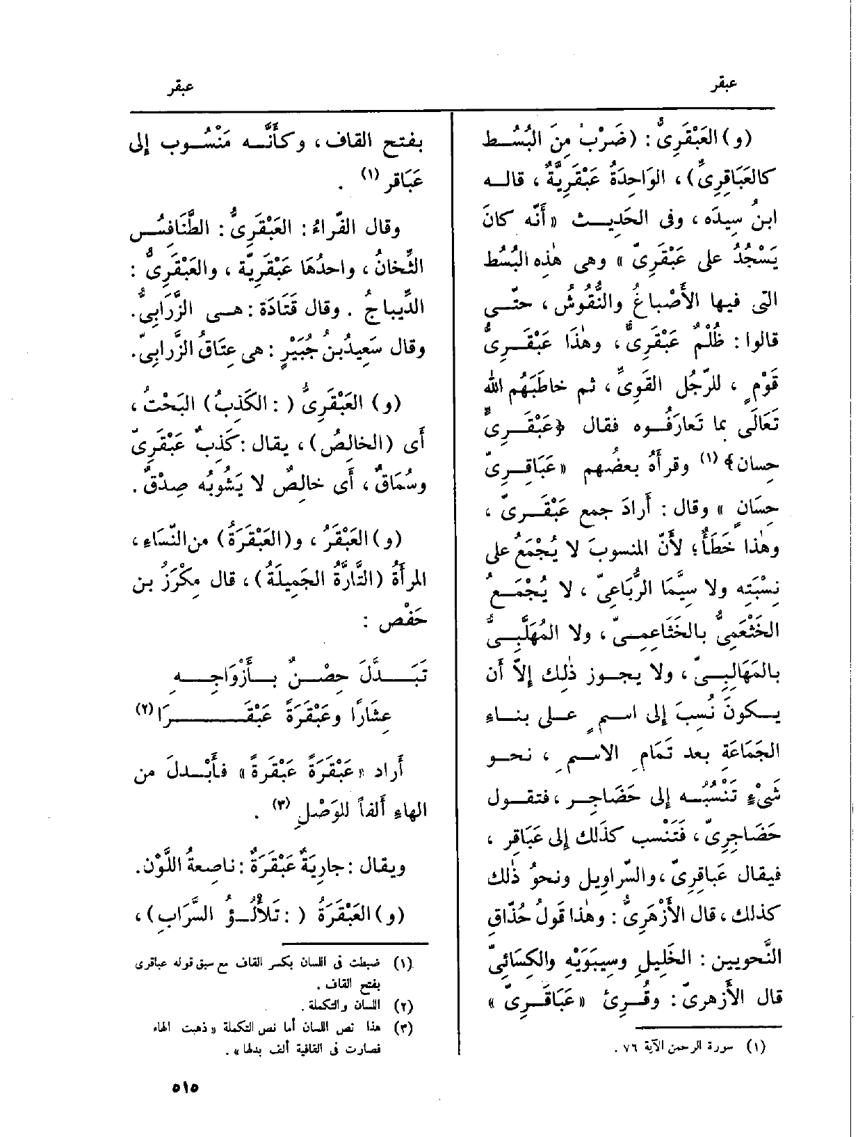 (و) العَبْقَرِيُّ: (ضَرْبٌ مِنَ البُسُط كالعَبَاقِرِيِّ) ، الوَاحِدَةُ عَبْقَرِيَّةٌ، قَالَه ابنُ سِيدَه، وَفِي الحَدِيث: (أَنّه كانَ يَسْجُدُ على عَبْقَرِيّ) وَهِي هاذِه البُسُط الَّتِي فِيهَا الأَصْباغُ والنُّقُوشُ، حتّى قَالُوا: ظُلْمٌ عَبْقَرِيٌّ، وهاذَا عَبْقَرِيُّ قَوْمٍ، للرّجُل القَوِيِّ، ثمَّ خاطَبَهُم الله تَعالَى بِمَا تَعارَفُوه فَقَالَ: {} (الرَّحْمَن: 76) ، وقرأَهُ بعضُهم: (عَبَاقِرِيّ حِسَانٍ) ، وَقَالَ: أَرادَ جمع عَبْقَريّ، وهاذا خَطَأٌ؛ لأَنّ المنسوبَ لَا يُجْمَعُ على نِسْبَتِه وَلَا سِيَّمَا الرُّبَاعِيّ، لَا يُجْمَعُ الخَثْعَمِيُّ بالخَثَاعِمِيّ، وَلَا المُهَلَّبِيُّ بالمَهَالِبِيّ، وَلَا يجوز ذالِك إِلاّ أَن يكونَ نُسِبَ إِلى اسمٍ على بناءِ الجَمَاعَةِ بعد تَمَامِ الاسمِ، نَحْو شيءٍ تَنْسُبُه إِلى حَضَاجِر، فَتَقول حَضَاجِرِيّ، فتَنْسَب كذَلك إِلى عَبَاقِر، فَيُقَال عَبَاقِرِيّ، والسّراوِيل ونحوُ ذالك كَذَلِك، قَالَ الأَزْهَرِيُّ: وهاذا قَولُ حُذّاقِ النَّحويين: الخَلِيلِ وسِيبَوَيْهِ والكِسَائِيّ. قَالَ الأَزْهريّ: وقُرِىء (عَبَاقَرِيّ) بِفَتْح الْقَاف، وكأَنَّه مَنْسُوب إِلى عَبَاقر.