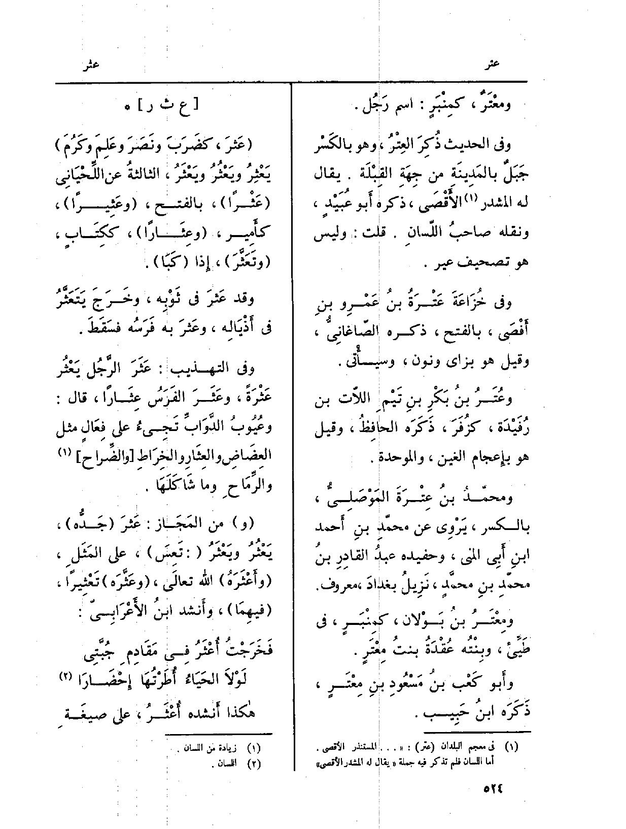 وَفِي التَّهْذِيب: عَثَرَ الرَّجلُ يَعْثُر عَثْرَةً، وعَثَرَ الفَرَسُ عِثَاراً، قَالَ: وعُيُوبُ الدَّوَابِّ تَجِيءُ على فِعَالٍ مثل العِضَاضِ والعِثَارِ والخِرَاطِ والضِّراح والرِّماحِ وَمَا شَاكَلَهَا.