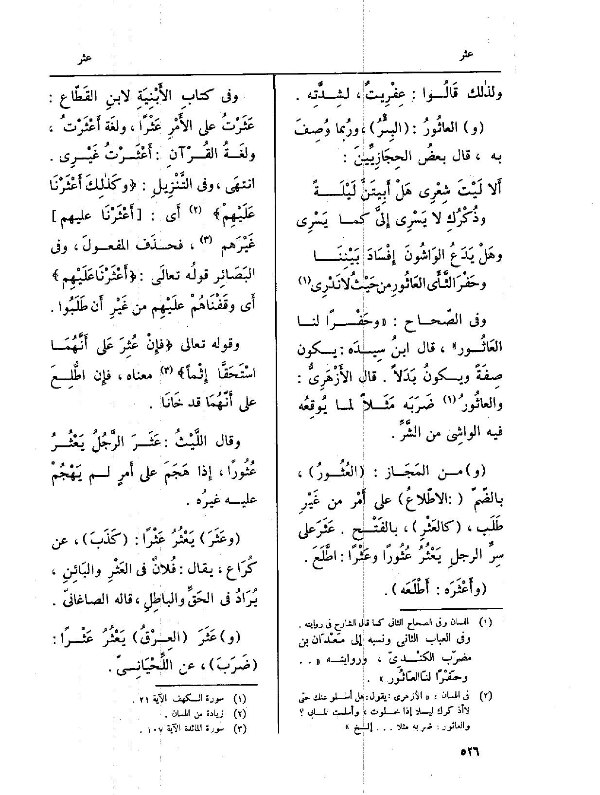 وَفِي كتاب الأَبْنِيَةِ لابنِ القَطّاع: عَثَرْتُ على الأَمْرِ عَثْراً، ولغَة أَعْثَرْتُ، ولغَةُ القُرْآنِ: أَعْثَرْتُ غَيْرِي. انتهَى، وَفِي التَّنْزِيلِ: {وَكَذالِكَ أَعْثَرْنَا عَلَيْهِمْ} (الْكَهْف: 21) ، أَي: أَعْثرْنَا عَلَيْهِم غَيْرَهم، فحذَف المفعولَ، وَفِي البَصائِر قولُه تعالَى: {أَعْثَرْنَا عَلَيْهِمْ} أَي وقَفْنَاهُمْ علَيْهِم من غَيْرِ أَن طَلَبُوا.