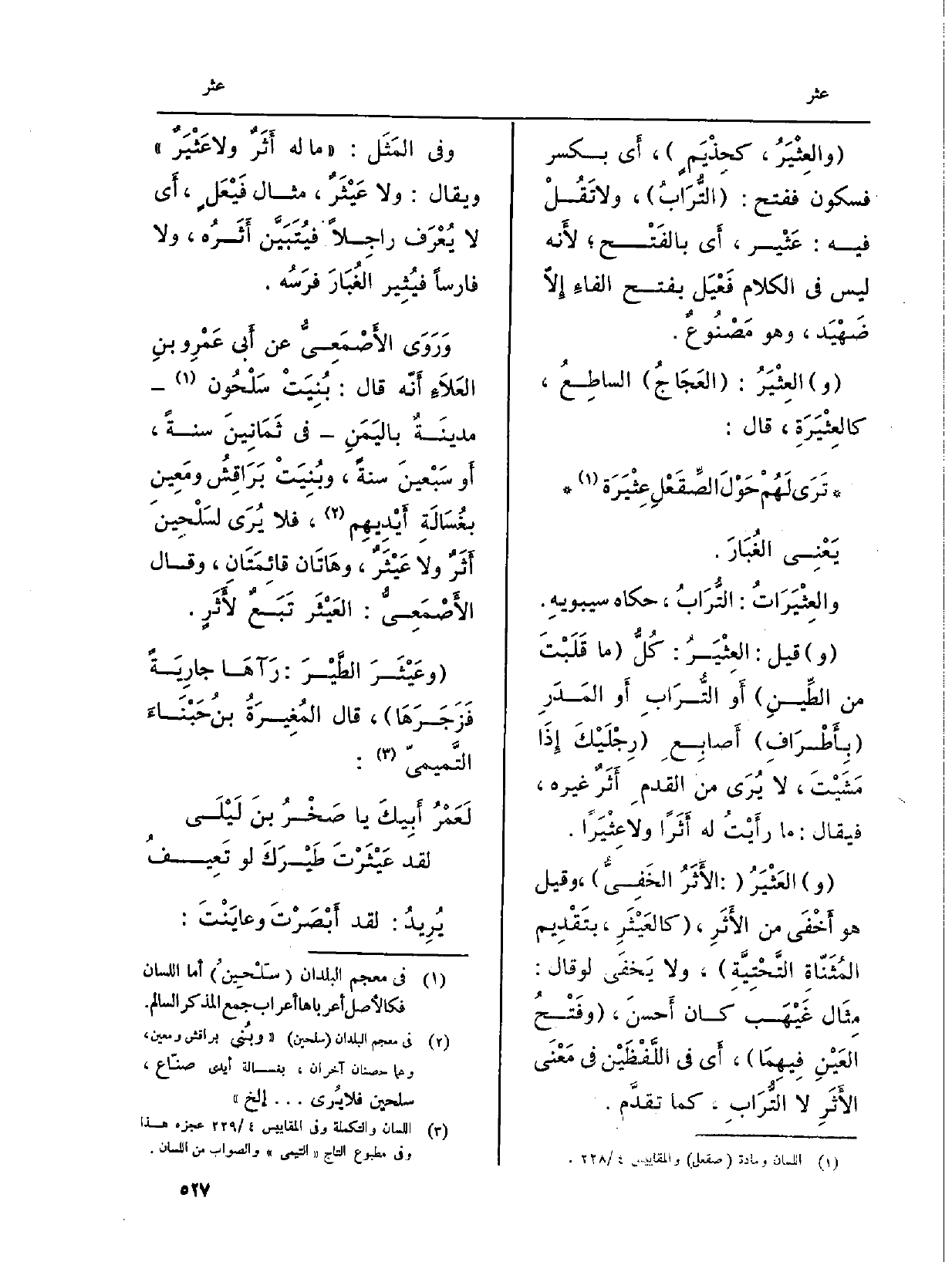 ورَوَى الأَصْمَعِيُّ عَن أَبي عَمْرِو بنِ العَلاَءِ أَنّه قَالَ: بُنِيَتْ سَلْحُون مدينَةٌ باليَمَنِ فِي ثَمَانِينَ سنة، أَو سَبْعينَ سنة، وبُنِيَتْ بَرَاقِشُ ومَعِينِ بغُسَالَةِ أَيْدِيهِم، فَلَا يُرَى لسَلْحِينَ أَثَرٌ وَلَا عَيْثَرٌ، وهَاتَان قائِمَتَان، وَقَالَ الأَصْمَعِيُّ: العَيْثَر تَبَعٌ لأَثَرٍ.