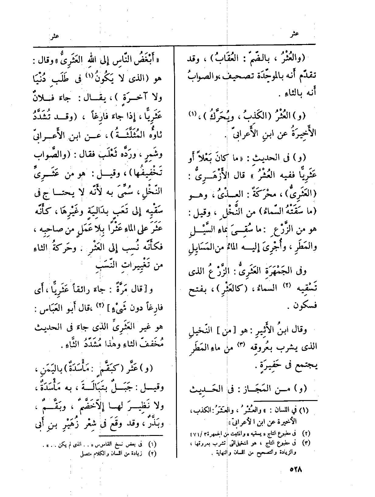 (و) من المَجَاز: فِي الحَدِيث: (أَبْغَضُ النّاسِ إِلى اللَّهِ العَثَرِيُّ) ، وَقَالَ: هُوَ (الَّذِي لَا يَكُونُ فِي طَلَبِ دُنْيَا وَلَا آخرَةٍ) ، يُقَال: جاءَ فلانٌ عَثَرِيّاً،. إِذا جاءَ فارِغاً، (وَقد تُشَدَّدُ تاؤُه المُثَلَّثَةُ) ، عَن ابْن الأَعرابيّ وشَمِرٍ، ورَدَّه ثَعْلَب فَقَالَ: (والصَّواب تَخْفِيفُها) ، وَقيل: هُوَ من عَثَرِيِّ النّخْلِ، سُمِّيَ بِهِ لأَنّه لَا يحْتَاج فِي سَقْيِه إِلى تَعَبٍ بدَالِيَةٍ وغَيْرِهَا، كأَنّه عَثَرَ على الماءِ عَثْراً بِلَا عَمَلٍ من صاحِبِه، فكأَنّه نُسِب إِلى العَثْرِ. وحَركةُ الثاءِ من تَغْيِيراتِ النّسَبِ.