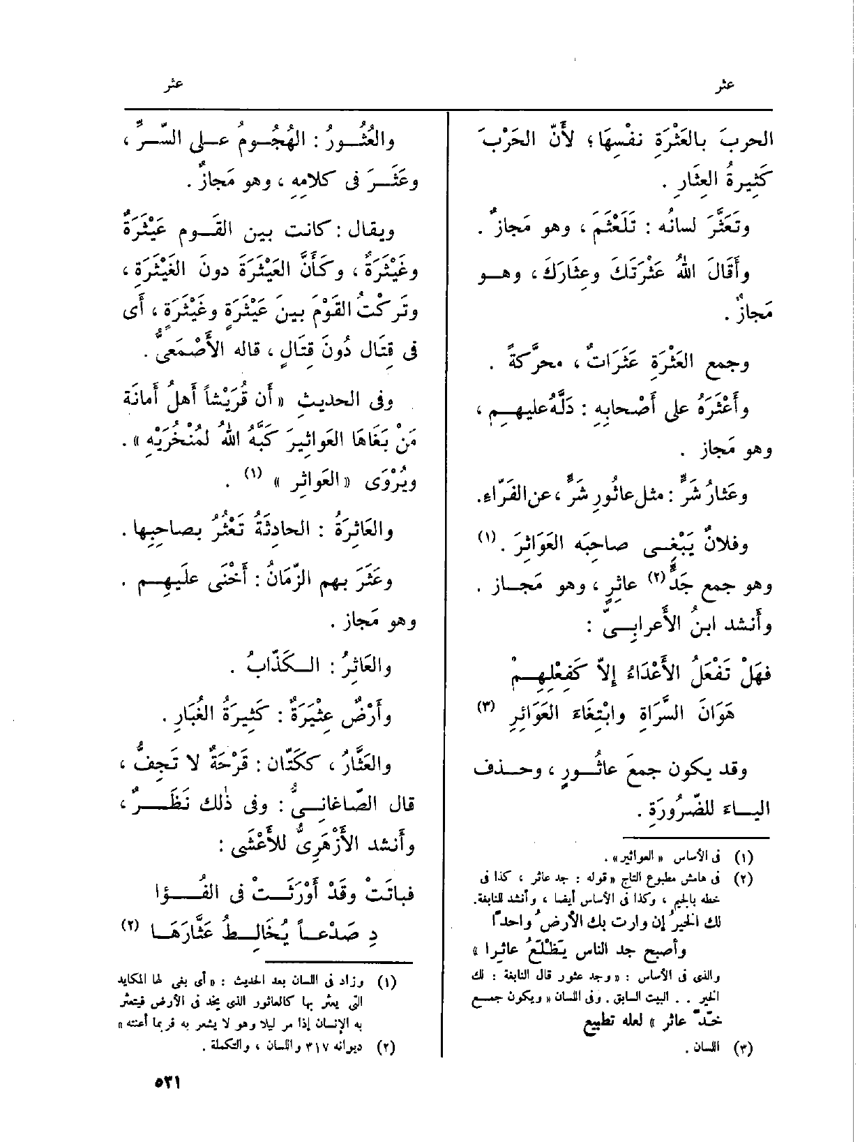 وفلانٌ يَبْغِي صاحِبَه العَوَاثِرَ. وَهُوَ جمع جِدَ عاثِرٍ، وَهُوَ مَجاز. وأَنشد ابنُ الأَعرابِيّ: