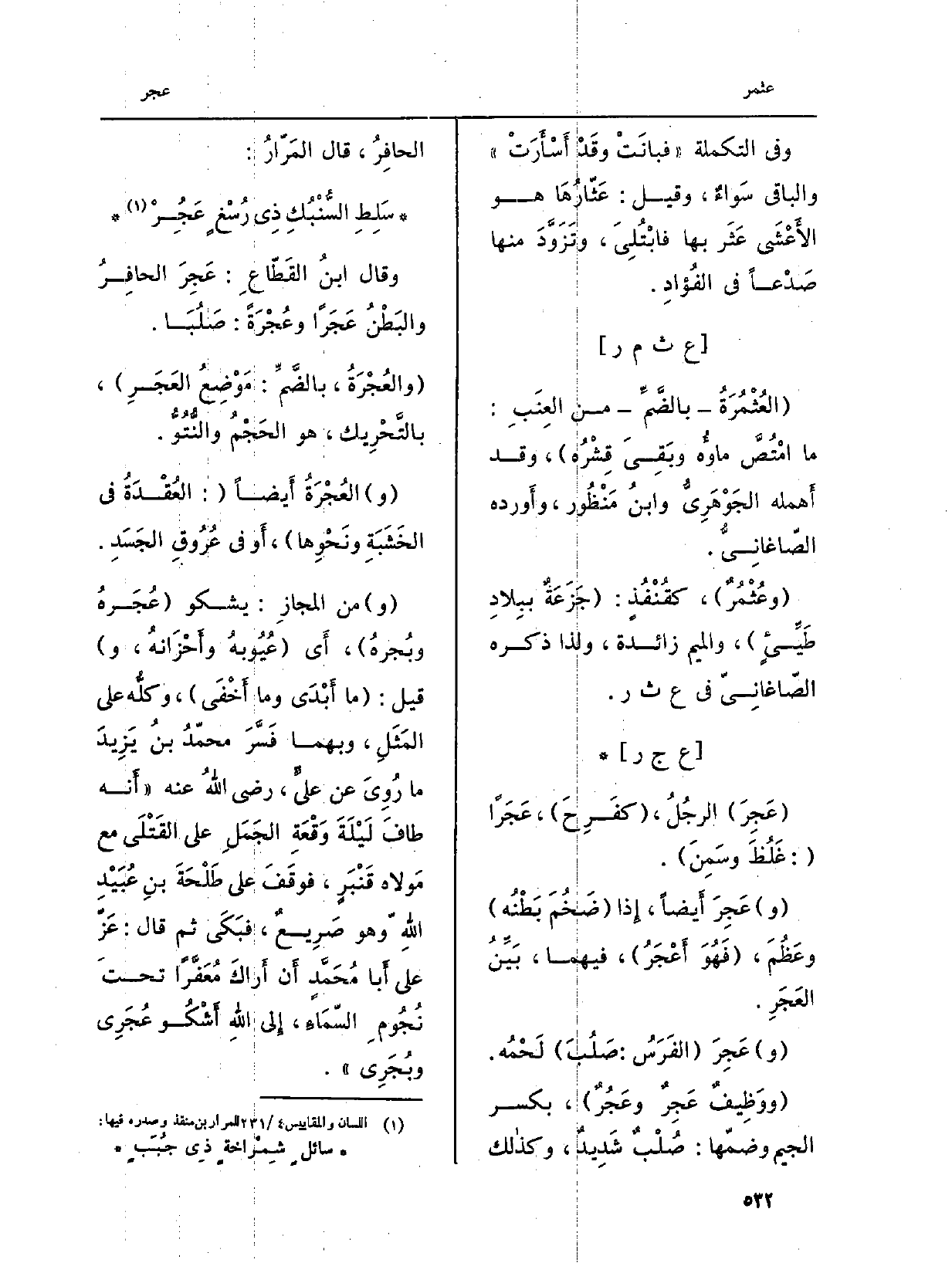 (وعُثْمُرٌ) ، كقُنْفُذٍ: (جَزَعَةٌ ببِلادِ طَيِّىءٍ) ، وَالْمِيم زَائِدَة، وَلذَا ذكره الصّاغانِيّ فِي عثر.
